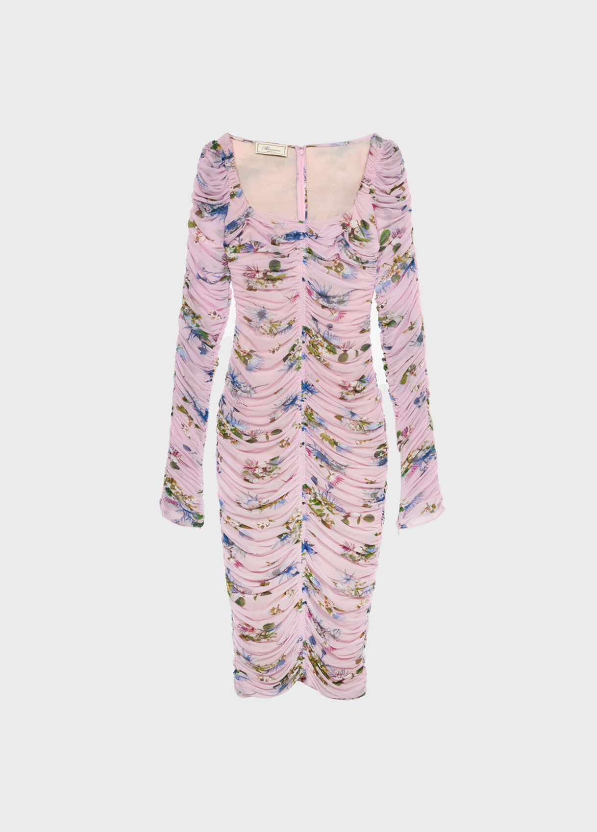 a romantic bouquet print for the midi dress in stretch nylon tulle with gathering patterns. - Stretch nylon tulle - Bouquet print - All-over gathering pattern - Square neckline - Long sleeves - Back zip closure - Inner lining - Midi length - Regular fit - Made in Italy DETAILS To find the correct size for you, please consult the Size Guide. Composition: Main fabric: 94% polyamide, 6% elastane; Main lining: 75% polyamide, 25% elastane Wash delicate cycle max 30°C; Do not bleach; Do not tumble dry; Do not iron; Dry clean with tetrachloroethylene or hydrocarbons - gentle cycle; Dry flat in shade; Wash inside out; Gentle spin