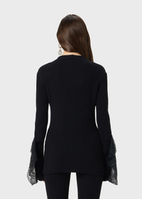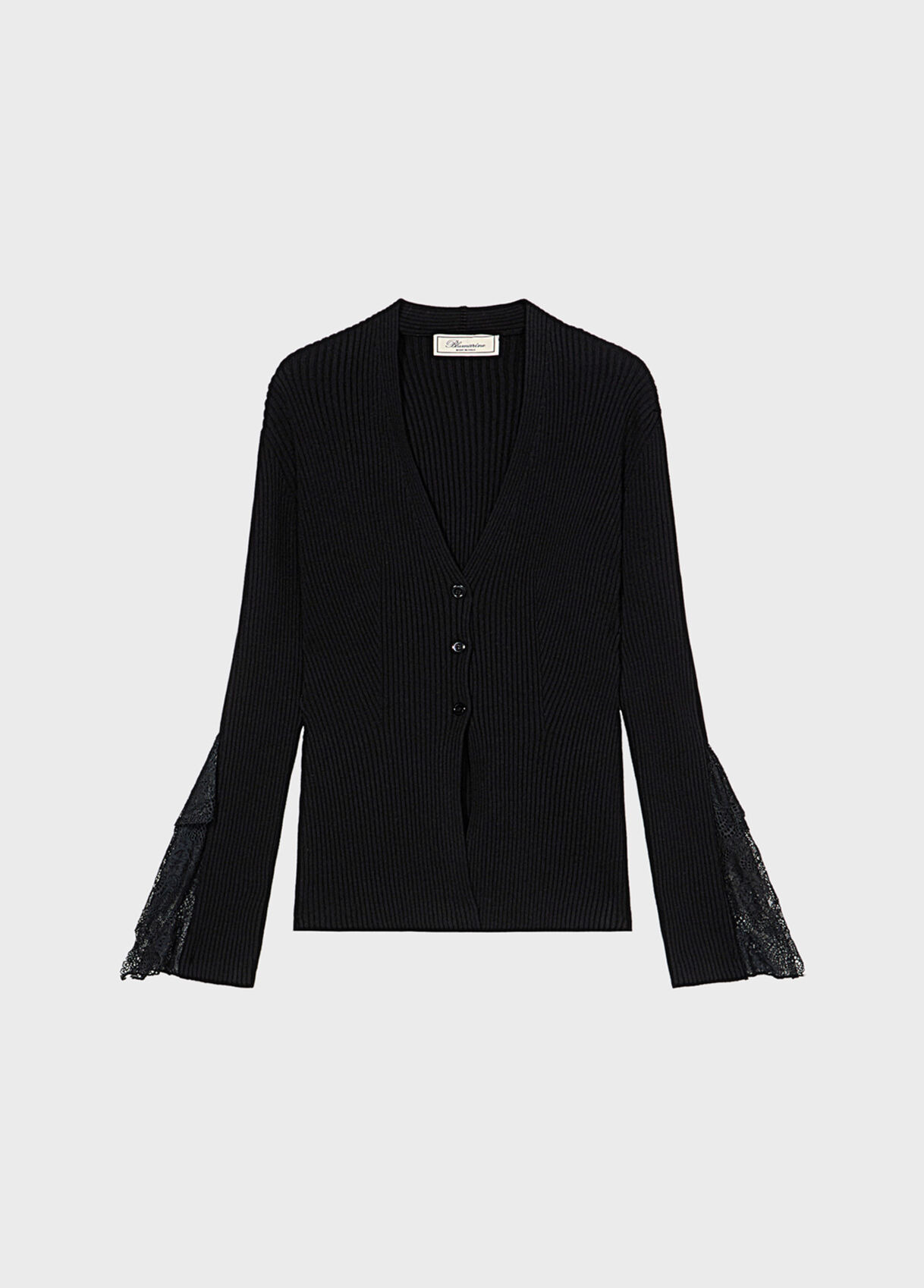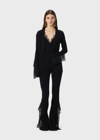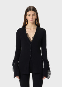 Ribbed cardigan with lace ruffle appliques on the cuffs. - Wool-blend rib - V-neck - Long sleeves - Ruffled lace details at the cuffs - Button closure - Body-hugging fit DETAILS To find the correct size for you, please consult the Size Guide. Composition: Yarn 1: 72% viscose, 28% polyester; Lace: 100% polyamide Hand wash - room temperature; Do not bleach; Do not tumble dry; Iron at low temperature - no steam; Dry clean with tetrachloroethylene or hydrocarbons - gentle cycle; Dry flat in shade; Protect buttons when dry cleaning; Wash inside out; Iron inside out