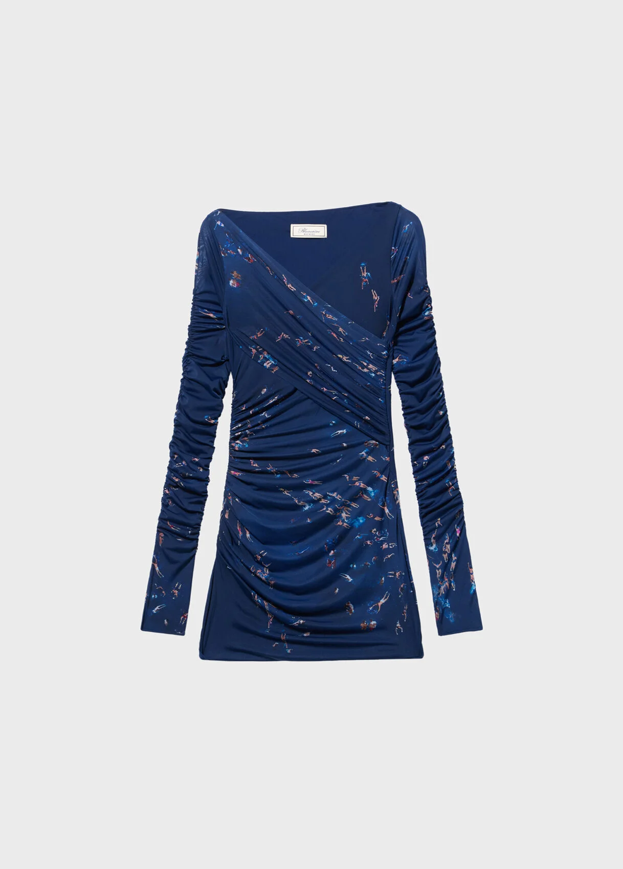 Short second-skin jersey dress with a swimmer's print, featuring a wrap detail on the front and a gathered design on the sleeves and sides. - Second-skin jersey - Swimmers print - V-neckline - Wrap design on front - Long sleeves with gathered detailing - Gathering on the sides - Mini length - Body-hugging fit - Made in Italy DETAILS Composition: External fabric: 90% Polyamide, 10% Elastane; Main lining: 75% Polyamide, 25% Elastane Gentle wash at max 30°C; Do not bleach; Do not tumble dry; Iron at low temperature - no steam; Dry clean with tetrachloroethylene or hydrocarbons - gentle cycle; Use a mild detergent; Wash inside out; Gentle spin cycle; Do not iron lining; Iron inside out