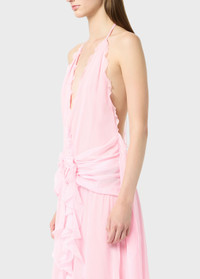 The deep halter neckline defines this long silk georgette dress with draped sashes at the sides forming a 3d rose that flows into ruffles at the hem. - Silk georgette - Halter neck style - Sleeveless cut - Side sashes with 3d rose - Ruffles - Front vent - Low-cut back - Fully lined - Zip closure at back - Fully lined - Floor-length - Regular fit - Made in Italy DETAILS To find the correct size for you, please consult the Size Guide. Composition: Main fabric: 100% silk; Main lining: 100% polyester Do not wash; Do not bleach; Do not tumble dry; Iron at low temperature - no steam; Dry clean with tetrachloroethylene or hydrocarbons - gentle cycle; Wash inside out; Iron inside out