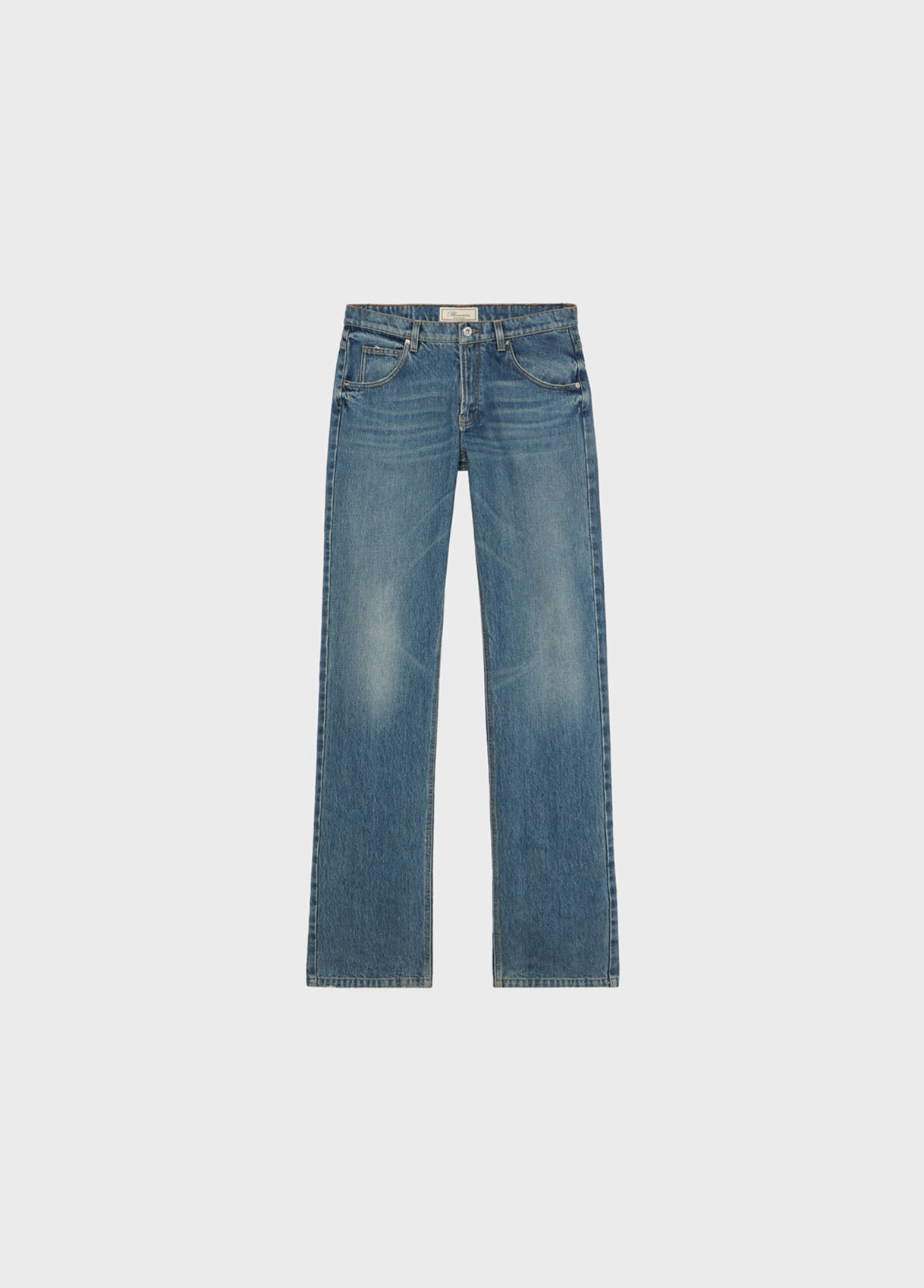 Five-pocket straight-leg jeans in stone-washed denim with blumarine logo printed in flock on the back. - Stone-washed denim - Blumarine logo printed in flock on the back - Straight leg style - Five-pocket style - Belt loops - Zipper and button closure - Puddle bottom - B monogram label at back - Regular fit DETAILS To find the correct size for you, please consult the Size Guide. Composition: Main fabric: 100% cotton; Fabric 2: 65% polyester, 35% cotton Wash delicate cycle max 30°C; Do not bleach; Do not tumble dry; Iron at low temperature - no steam; Do not dry clean; Hang dry in shade; Wash separately; Do not expose to direct heat; Wash inside out; Gentle spin; Iron inside out