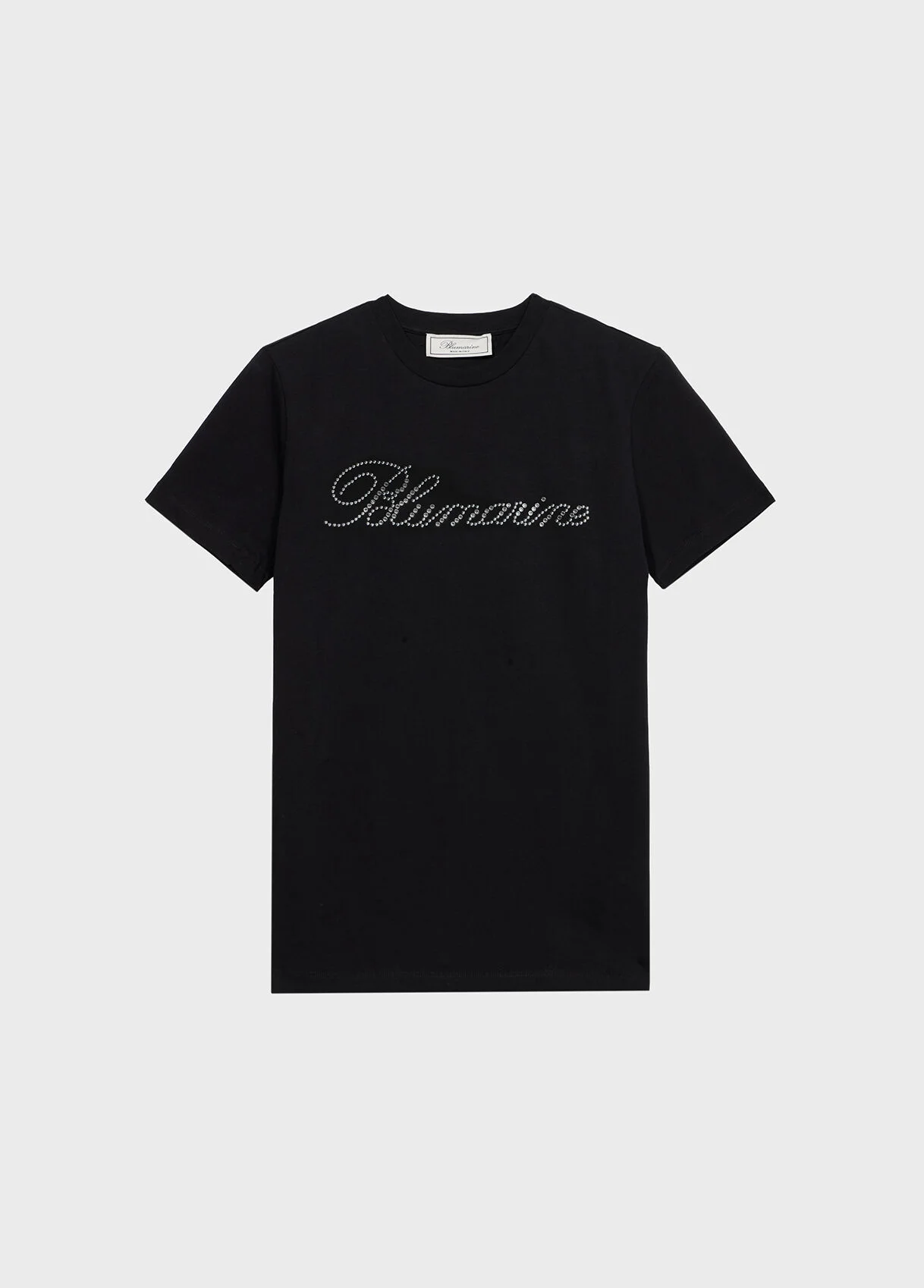 cotton jersey t-shirt with blumarine logo embroidery in glass strass. - Cotton jersey - Blumarine logo embroidery in glass strass rounded neckline - Short sleeves - Regular fit - Made in Italy DETAILS To find the correct size for you, please consult the Size Guide. Composition: Main fabric: 100% cotton; Embroidery: 50% aluminium, 50% glass Hand wash - room temperature; Do not bleach; Do not tumble dry; Iron at low temperature - no steam; Do not dry clean; Hang dry in shade; Wash separately; Do not leave in water; Wash inside out; Do not twist or squeeze; Iron inside out; Do not iron trims