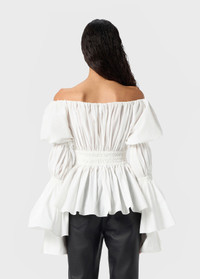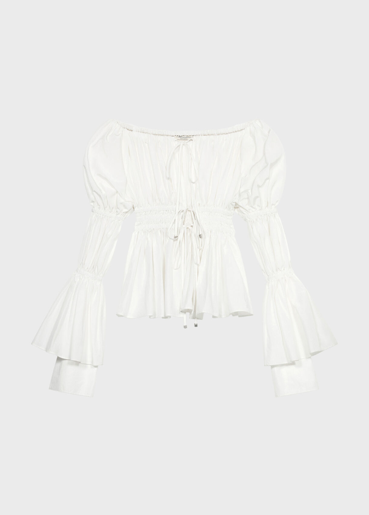 shiny technical canvas top with bare shoulders, featuring gathered design at the waist and on the sleeves, tie closure. - Shiny technical canvas - Honeycomb gathered design at the waist and on the sleeves - Bare shoulders - Long sleeves - Flared cuffs - Tie closure - Regular fit - Made in Italy DETAILS To find the correct size for you, please consult the Size Guide. Composition: Main fabric: 52% polyester, 48% cotton; Main lining: 100% polyamide Wash delicate cycle max 30°C; Do not bleach; Do not tumble dry; Iron at low temperature - no steam; Dry clean with tetrachloroethylene or hydrocarbons - gentle cycle; Wash inside out; Gentle spin; Iron inside out