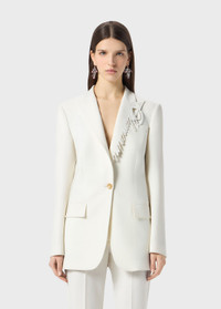 Single-breasted jacket in stretch wool twill with embroidered blumarine logo in thread on one lapel, welt pocket, flap pockets, and single-button closure. - Stretch wool twill - Blumarine logo embroidered in thread on one lapel - Single-breasted style - Collar - Lapels - Chest pocket - Flap pockets at the hips - Long sleeves - Buttoned cuffs - Button closure - Fully lined. regular fit - Made in Italy DETAILS To find the correct size for you, please consult the Size Guide. Composition: Main fabric: 54% polyester, 44% virgin wool, 2% elastane; Main lining: 100% polyester Wash delicate cycle max 30°C; Do not bleach; Do not tumble dry; Iron at low temperature - no steam; Dry clean with tetrachloroethylene or hydrocarbons - gentle cycle; Wash inside out; Iron inside out