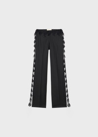 Straight-leg pants in wool twill with scalloped lace ruffles cascading down the sides. - Wool twill - Straight leg - Scalloped lace decorations at waist - Scalloped lace ruffles at the sides - Zip closure at side - Regular fit DETAILS To find the correct size for you, please consult the Size Guide. Composition: Main fabric: 54% polyester, 44% virgin wool, 2% elastane; Fabric 2: 57% viscose, 43% polyester; Lace: 81% polyamide, 19% ramie Do not wash; Do not bleach; Do not tumble dry; Iron at low temperature - no steam; Dry clean with tetrachloroethylene or hydrocarbons - gentle cycle; Wash inside out; Iron inside out