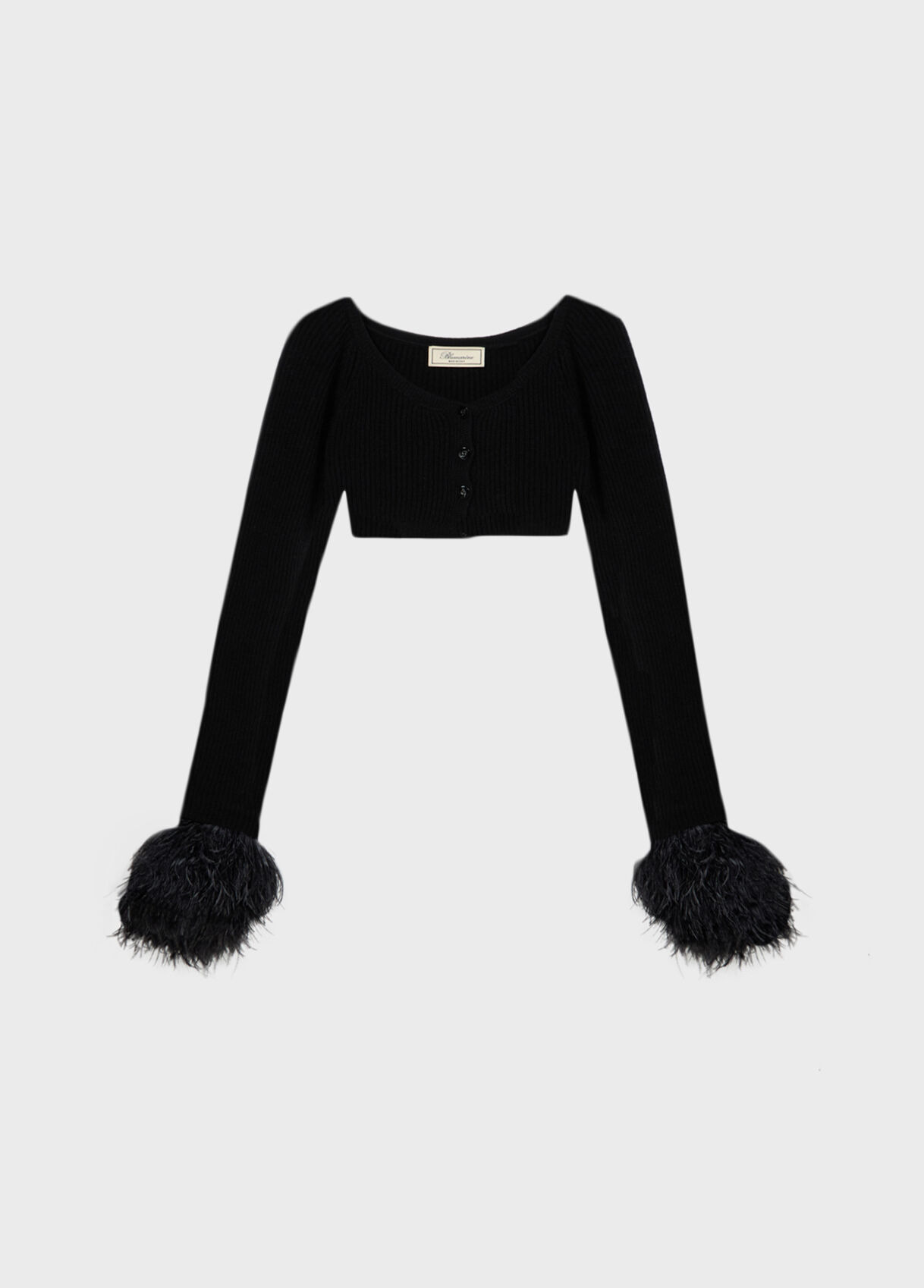 Cropped cardigan in ribbed wool with wide neckline and feather-trimmed cuffs. - Fisherman's rib stitch wool - Cropped design - Round neckline - Long sleeves - Feather-trimmed cuffs - Button closure - Body-hugging fit - Made in Italy DETAILS To find the correct size for you, please consult the Size Guide. Composition: Main lining: 100% polyester; Padding (Fibres): 100% polyester; Yarn 1: 100% wool Do not wash; Do not bleach; Do not tumble dry; Iron at low temperature - no steam; Dry clean with tetrachloroethylene or hydrocarbons - gentle cycle; Protect buttons when dry cleaning; Remove detachable accessories before cleaning; Wash inside out