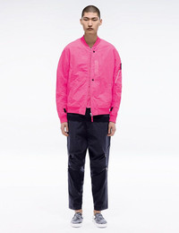 A truly one of a kind bomber. A unique piece completely sold out everywhere. You can’t find even used pieces. 40402 FLANK POCKET BOMBER WITH DROP POCKETS AND ARTICULATION TUNNELS (NASLAN) PRODUCT DETAILS FABRIC RESEARCH AND TREATMENT NASLAN SINGLE LAYER FABRIC - GARMENT DYED WITH ANTI-DROP AGENT: Bomber jacket in Naslan, a durable and abrasion resistant fabric composed of mechanically spun heavy plain-weave nylon. During the spinning process, the nylon filaments are steamed to achieve a more palpable organic texture. This added dimension of softness coupled with the overall density makes the fabric ideally suited for wear. A final garment-dye treatment produces a distinctly vivid elegance absent from standard nylon. An anti-drop formula added to the dye ensures optimal water and dirt repellence