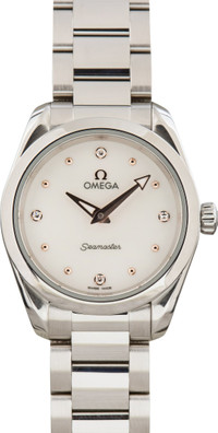 Why We Love This Watch This used Omega Seamaster Aqua Terra 150M ref. 220.10.28.60.54.001 (Ladies) defines refined elegance in a compact 28mm stainless steel case. The shimmering white dial is detailed with eight 18K Sedna gold dot markers and four diamonds set in 18K Sedna gold holders, complemented by matching gold hands. A stainless steel integrated bracelet ensures a seamless, sophisticated look, while the solid caseback is embossed with Omega’s iconic Seahorse on a wavy motif. Powered by the OMEGA Calibre 4061 quartz movement, this timepiece combines precision, luxury, and enduring style for discerning collectors. WATCH DETAILS CREDIT CARD PRICE $3,287.66 BRAND OMEGA MODEL NAME Seamaster COLLECTION NAME Aqua Terra MODEL NUMBER 220.10.28.60.54.001 ITEM NUMBER 181392 CONDITION Excellent GENDER Womens BOX & PAPERS Service Box CASE MATERIAL Stainless Steel CRYSTAL Sapphire SIZE 28MM BEZEL Stainless Steel Smooth CASEBACK Solid SERIAL 92637XXX DIAL White Diamond w/ Diamond hour markers, Luminous hands & Luminous lume MOVEMENT CALIBRE 4061 TYPE Quartz BEZEL Fixed COMPLICATION No Date BRACELET MATERIAL Stainless Steel CLASP Butterfly