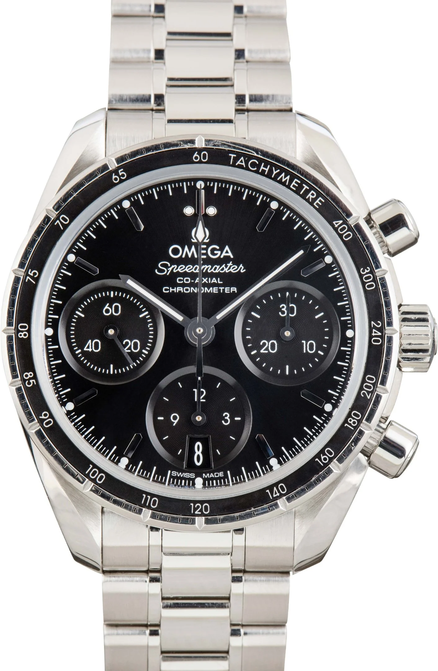 Why We Love This Watch This pre-owned OMEGA Speedmaster 38 ref. 324.30.38.50.01.001 is crafted in a 38 mm stainless steel case with a black aluminum tachymeter bezel, scratch-resistant sapphire crystal, and 100 meters of water resistance. The black dial features rhodium-plated hands and indexes, three chronograph subdials, and a date window at 6 o’clock, while the case measures 44.9 mm lug-to-lug, 14.7 mm thick, and includes 18 mm lugs. Fitted to a stainless steel bracelet and weighing approximately 132 grams, this model is powered by the self-winding Co-Axial Calibre 3330, offering a 52-hour power reserve, a screw-down crown, and a Seahorse medallion caseback—balancing everyday wearability with Speedmaster chronograph performance. WATCH DETAILS BRAND OMEGA MODEL NAME Speedmaster 38 COLLECTION NAME Moonwatch MODEL NUMBER 324.30.38.50.01.001 ITEM NUMBER 183814 CONDITION Excellent GENDER Mens BOX & PAPERS Box and Papers CASE MATERIAL Stainless Steel CRYSTAL Sapphire SIZE 38MM BEZEL Aluminum Tachymetric CASEBACK Solid SERIAL 84218XXX DIAL Black w/ Index hour markers, Luminous hands & Luminous lume MOVEMENT CALIBRE 3330 TYPE Automatic BEZEL Fixed COMPLICATION Chronograph BRACELET MATERIAL Stainless Steel CLASP Butterfly