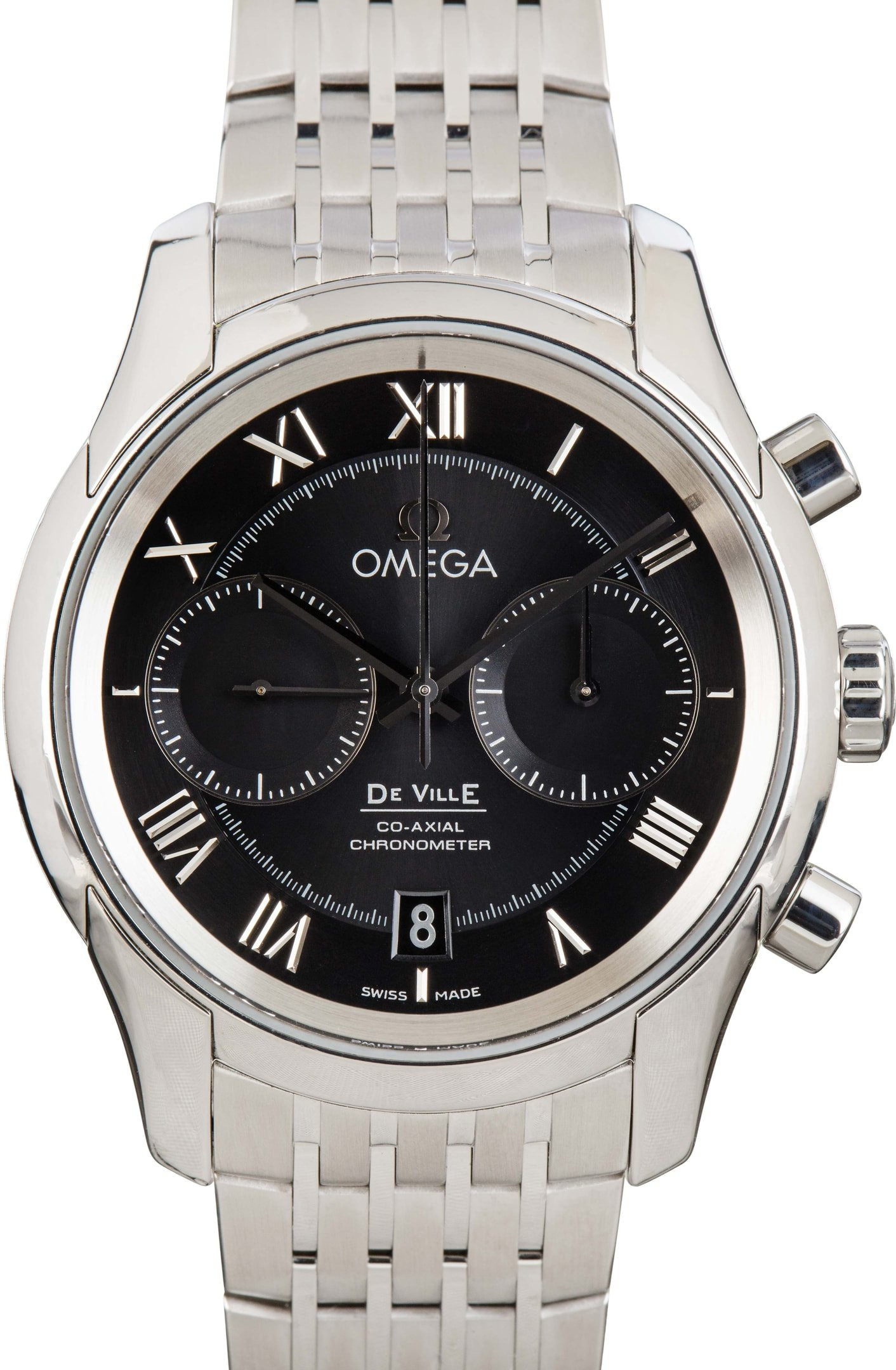 Why We Love This Watch Pre-owned Omega De Ville Hour Vision ref 431.10.42.51.01.001 (2012) blends refined elegance with chronograph functionality. Housed in a 42mm stainless steel case, this model features a two-zone black dial with Roman numeral hour markers, a date window at 6 o’clock, and subdials for small seconds, 60-minute, and 12-hour counters—all protected by a scratch-resistant sapphire crystal. Powered by the OMEGA Co-Axial calibre 9300, visible through the exhibition caseback, this timepiece offers exceptional precision and reliability. The stainless steel bracelet fits wrists up to 7.25 inches. WATCH DETAILS CREDIT CARD PRICE $4,110.86 BRAND OMEGA MODEL NAME De Ville MODEL NUMBER 431.10.42.51.01.001 YEAR 2012 ITEM NUMBER 180226 CONDITION Excellent GENDER Mens BOX & PAPERS Papers Only CASE MATERIAL Stainless Steel CRYSTAL Sapphire SIZE 42MM BEZEL Stainless Steel Smooth SERIAL 85587XXX DIAL Black w/ Roman hour markers, Nonluminous hands & Nonluminous lume MOVEMENT CALIBRE 9300 TYPE Automatic BEZEL Fixed COMPLICATION Chronograph BRACELET MATERIAL Stainless Steel CLASP Foldover
