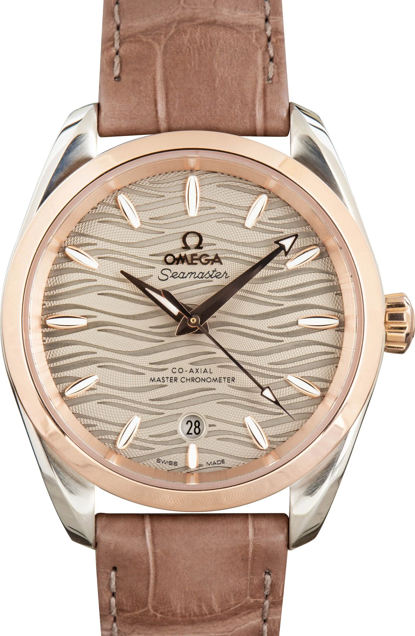 Why We Love This Watch This pre-owned Omega Seamaster Aqua Terra 150M ref 220.23.38.20.06.001 perfectly blends elegance with the spirit of the sea. The 38mm symmetrical case combines stainless steel with 18K Sedna gold, complementing a waved agate grey dial with a date window at 6 o’clock. Hands and sailboat-hull-shaped indexes are crafted in 18K Sedna gold, while a taupe-brown leather strap completes the refined look. Powered by the OMEGA Master Chronometer Calibre 8800, certified by METAS for precision and performance, this Aqua Terra 150M is a true statement of sophisticated craftsmanship. WATCH DETAILS CREDIT CARD PRICE $7,197.86 BRAND OMEGA MODEL NAME Seamaster COLLECTION NAME Aqua Terra MODEL NUMBER 220.23.38.20.06.001 ITEM NUMBER 180841 CONDITION Excellent GENDER Womens Unisex BOX & PAPERS No Box or Papers CASE MATERIAL Steel and Rose Gold CRYSTAL Sapphire SIZE 38MM BEZEL 18k Rose Gold Smooth CASEBACK Exhibition SERIAL 89802XXX DIAL Slate w/ Index hour markers, Luminous hands & Luminous lume MOVEMENT CALIBRE 8800 TYPE Automatic BEZEL Fixed COMPLICATION Date BRACELET MATERIAL Leather TYPE Leather CLASP Foldover
