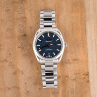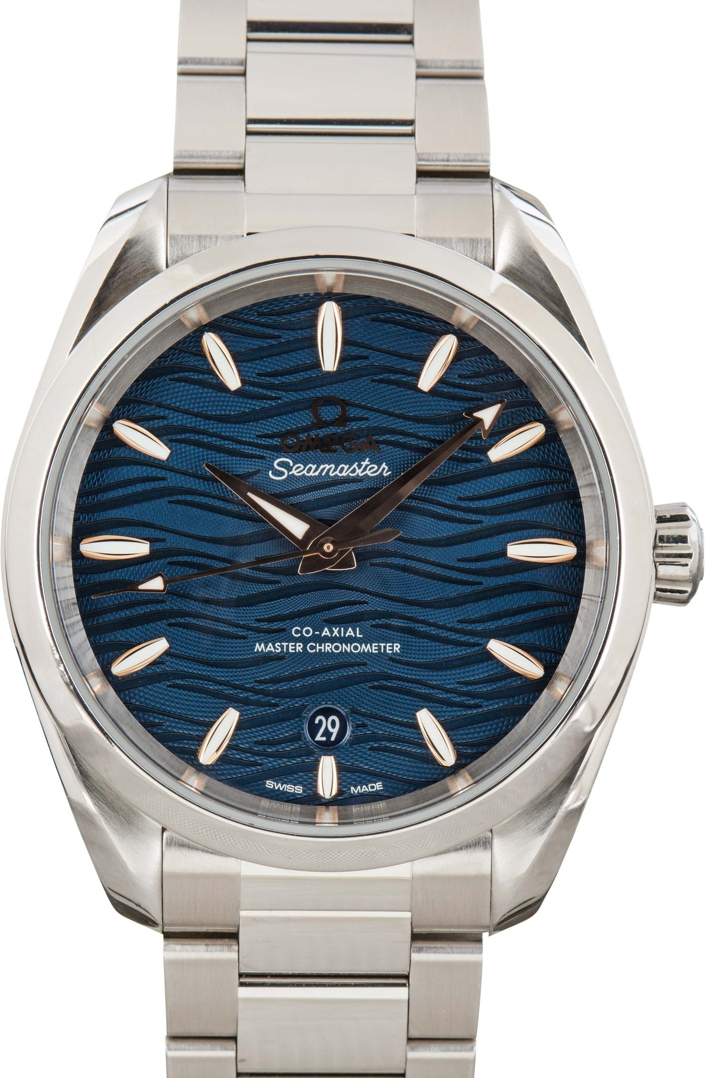 Why We Love This Watch Pre-owned Omega Seamaster Aqua Terra 150M ref. 220.10.38.20.03.002 (2018–2025) exudes refined sportiness with a 38mm stainless steel case and integrated bracelet. Its waved blue dial features 18K Sedna™ gold hands and sailboat-hull indexes, plus a date at 6 o’clock. Powered by the Master Chronometer Calibre 8800, METAS-certified for precision, this Aqua Terra balances timeless style with Swiss-engineered performance. WATCH DETAILS CREDIT CARD PRICE $4,728.26 BRAND OMEGA MODEL NAME Seamaster COLLECTION NAME Aqua Terra MODEL NUMBER 220.10.38.20.03.002 ITEM NUMBER 175095 CONDITION Excellent GENDER Mens Womens Unisex BOX & PAPERS Box and Papers CASE MATERIAL Stainless Steel CRYSTAL Sapphire SIZE 38MM BEZEL Stainless Steel Smooth CASEBACK Exhibition SERIAL 82196XXX DIAL Blue w/ Luminous hour markers, Luminous hands & Luminous lume MOVEMENT CALIBRE 8800 TYPE Automatic BEZEL Fixed COMPLICATION Date BRACELET MATERIAL Stainless Steel CLASP Butterfly