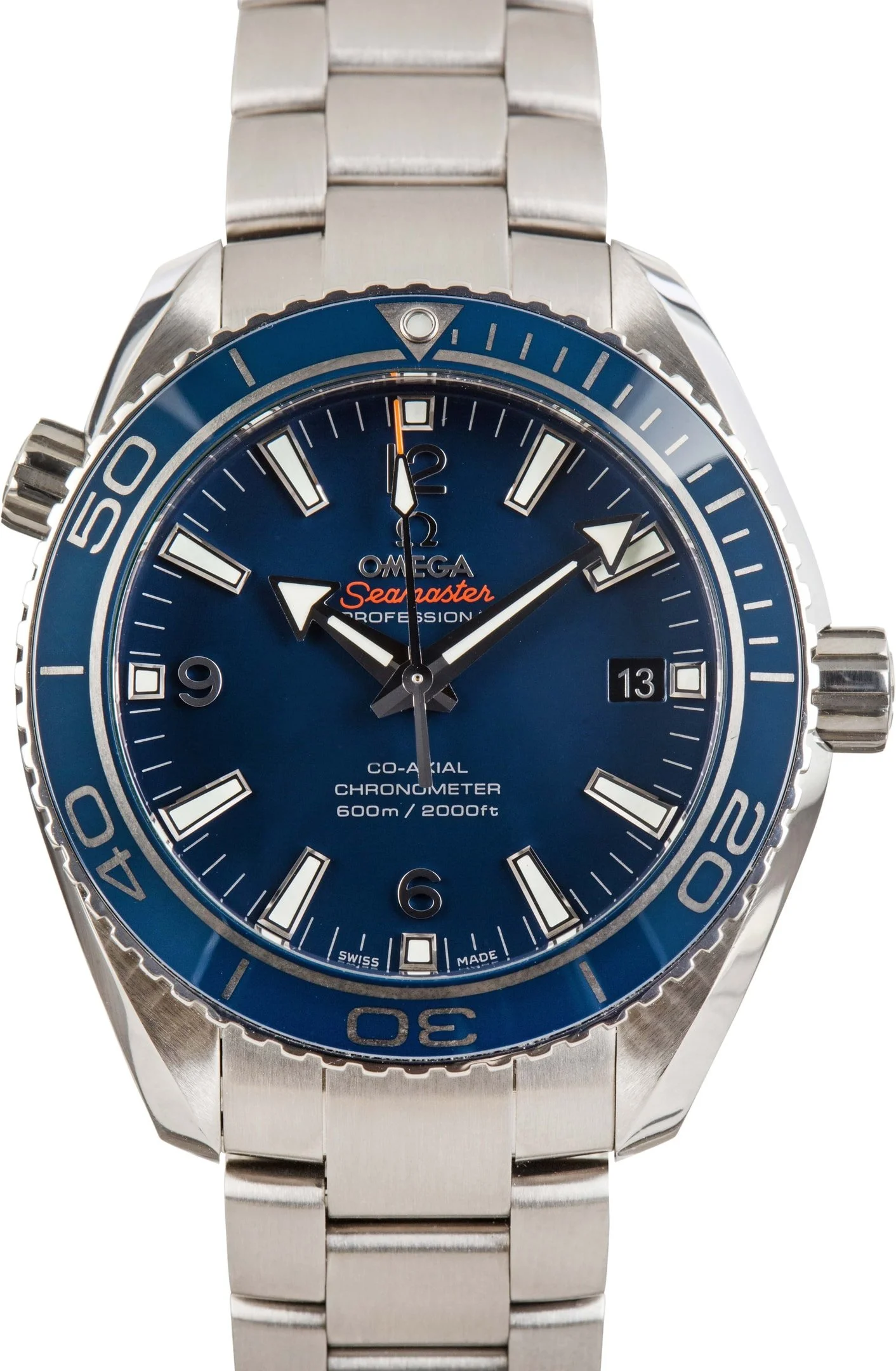 Why We Love This Watch This pre-owned OMEGA Seamaster Planet Ocean 600M ref. 232.90.42.21.03.001 reflects OMEGA’s professional dive watch heritage, featuring a 42 mm lightweight titanium case and matching titanium bracelet. A blue dial with a date window at 3 o’clock sits beneath a scratch-resistant sapphire crystal, complemented by a blue unidirectional rotating diver’s bezel. Engineered for extreme conditions, this Planet Ocean offers 600 meters / 2,000 feet of water resistance and includes a helium escape valve for saturation diving. Powering the watch is the self-winding Co-Axial Calibre 8500, a certified chronometer known for its precision, durability, and modern mechanical architecture. WATCH DETAILS BRAND OMEGA MODEL NAME Seamaster COLLECTION NAME Planet Ocean MODEL NUMBER 232.90.42.21.03.001 ITEM NUMBER 183848 CONDITION Excellent GENDER Mens BOX & PAPERS Box and Papers CASE MATERIAL Titanium CRYSTAL Sapphire SIZE 42MM BEZEL Ceramic Timing CASEBACK Exhibition SERIAL 85950XXX DIAL Blue w/ Arabic hour markers, Luminous hands & Luminous lume MOVEMENT CALIBRE 8500 TYPE Automatic BEZEL Unidirectional COMPLICATION Date BRACELET MATERIAL Titanium CLASP Foldover