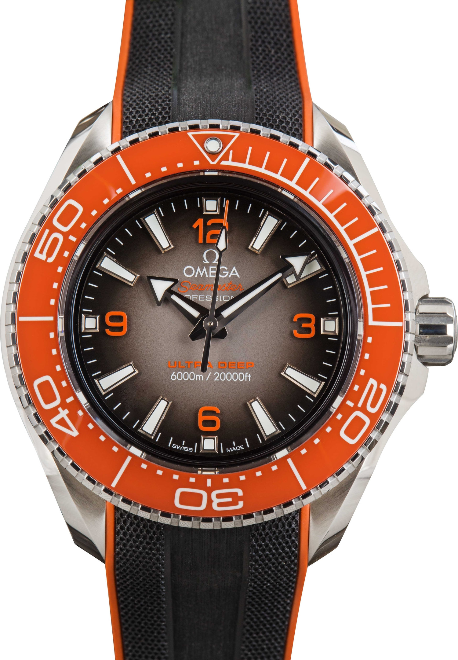 Why We Love This Watch This pre-owned Omega Seamaster Planet Ocean 600M Ultra Deep ref. 215.32.46.21.06.001 (2016) is a professional-grade diver’s watch born from record-breaking exploration. Crafted in robust O-MEGASTEEL, it boasts a striking gradient grey-to-black dial with bold orange accents, a polished orange ceramic bezel, and luminous 18K white gold hands for maximum legibility. Water-resistant to an extraordinary 6,000 meters, this timepiece is powered by the Master Chronometer Calibre 8912 and secured on a sporty rubber strap with orange lining. A true statement of innovation and endurance, it’s built for collectors who want a watch with both history and cutting-edge performance. WATCH DETAILS BRAND OMEGA MODEL NAME Seamaster COLLECTION NAME Planet Ocean MODEL NUMBER 215.32.46.21.06.001 YEAR 2016 ITEM NUMBER 181290 CONDITION Excellent GENDER Mens BOX & PAPERS Box and Papers CASE MATERIAL Stainless Steel CRYSTAL Sapphire SIZE 46MM BEZEL Ceramic Timing CASEBACK Solid SERIAL 84222XXX DIAL Slate Ombre w/ Arabic hour markers, Luminous hands & Luminous lume MOVEMENT CALIBRE 8912 TYPE Automatic BEZEL Unidirectional COMPLICATION No Date BRACELET MATERIAL Rubber TYPE Rubber CLASP Tang Buckle