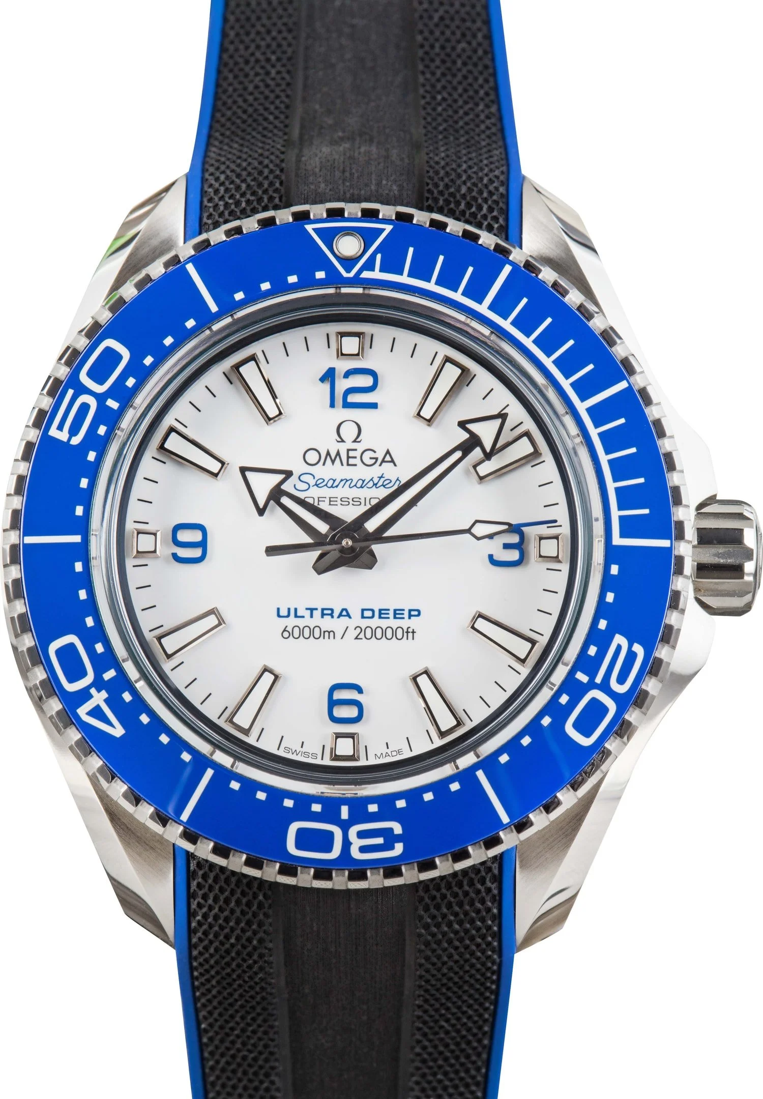 Why We Love This Watch This pre-owned Omega Seamaster Planet Ocean 600M Ultra Deep ref. 215.32.46.21.04.001 (2022) is a historic dive watch born from the Five Deeps Expedition, where it reached the deepest point on Earth. Crafted in robust O-MEGASTEEL, its 45.5mm case features a polished blue ceramic bezel, domed sapphire crystal, and a lacquered white dial with 18K white gold hands and hour markers coated in Super-LumiNova. Tested in real ocean conditions, it is water-resistant to 6,000 meters (20,000 ft.) and meets ISO 6425:2018 standards for saturation diving. Set on a blue-lined rubber strap with an O-MEGASTEEL buckle and finished with a Grade 5 titanium caseback medallion featuring a laser-engraved Sonar emblem, this Ultra Deep is powered by the OMEGA Co-Axial Master Chronometer Calibre 8912, combining record-breaking engineering with exceptional style. WATCH DETAILS CREDIT CARD PRICE $8,844.26 BRAND OMEGA MODEL NAME Seamaster COLLECTION NAME Planet Ocean MODEL NUMBER 215.32.46.21.04.001 YEAR 2022 ITEM NUMBER 185399 CONDITION Excellent GENDER Mens BOX & PAPERS Box and Papers CASE MATERIAL Stainless Steel CRYSTAL Sapphire SIZE 46MM BEZEL Ceramic Timing CASEBACK Solid SERIAL 84367XXX DIAL White w/ Arabic hour markers, Luminous hands & Luminous lume MOVEMENT CALIBRE 8912 TYPE Automatic BEZEL Unidirectional COMPLICATION No Date BRACELET MATERIAL Stainless Steel TYPE Rubber CLASP Tang Buckle
