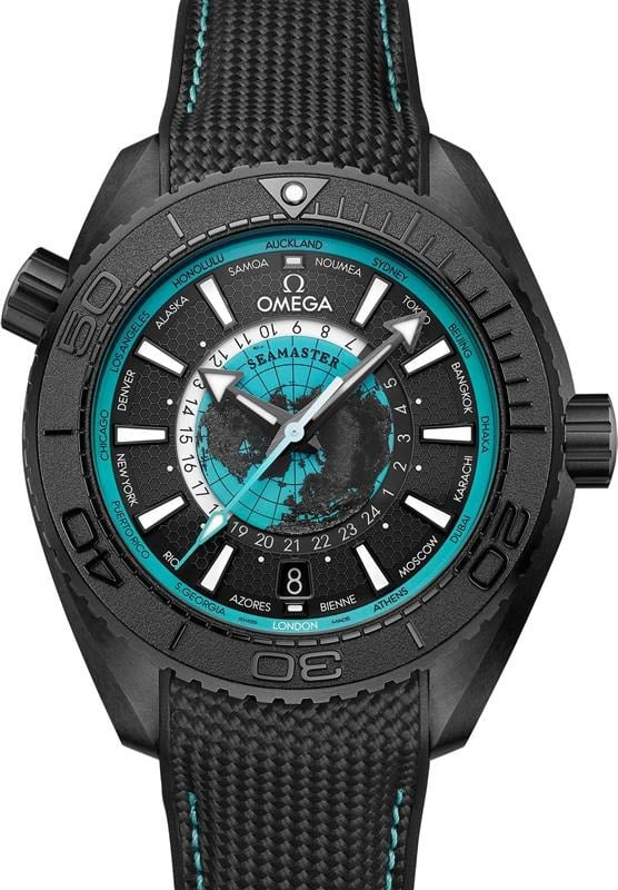 Why We Love This Watch This pre-owned Omega Seamaster Planet Ocean Worldtimer ref. 215.92.46.22.01.006 (2025) is a stunning companion for global travelers. Its 45.5mm black ceramic case and bezel frame a topographic Earth map on a grade 5 titanium dial, enhanced with laser-ablated detailing and turquoise accents. Diamond-brushed indexes, Super-LumiNova-filled hands, and a 24-hour day/night indicator provide exceptional legibility, while a world city ring keeps time zones at a glance. Finished on a black structured rubber strap with turquoise stitching, and powered by the Co-Axial Master Chronometer Calibre 8938, this Worldtimer blends technical mastery with bold, sophisticated style. WATCH DETAILS BRAND OMEGA MODEL NAME Seamaster COLLECTION NAME Diver 300M MODEL NUMBER 215.92.46.22.01.006 YEAR 2025 ITEM NUMBER 555555 CONDITION Excellent GENDER Mens BOX & PAPERS Box and Papers CASE MATERIAL Ceramic CRYSTAL Sapphire SIZE 46MM BEZEL Ceramic Timing DIAL Black Turquoise w/ Index hour markers, Luminous hands & Luminous lume MOVEMENT CALIBRE 8938 TYPE Automatic BEZEL Unidirectional COMPLICATION Date BRACELET MATERIAL Fabric/Canvas TYPE Rubber CLASP Foldover