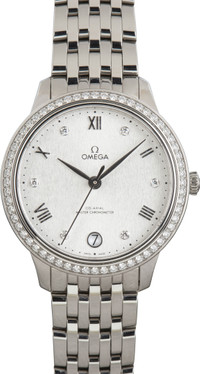 Why We Love This Watch Pre-owned Omega De Ville ref. 434.15.34.20.52.001 (2025) exudes refined elegance in a 34mm stainless steel case with a diamond-paved bezel. The silvery dial features a sun-brushed vertical pattern, rhodium-plated hands, and alternating Roman numerals and diamond hour markers, complemented by a date window at 6 o’clock and a dotted minute track. Certified as a Master Chronometer, this timepiece is powered by the OMEGA Master Co-Axial Calibre 8800, visible through the scratch-resistant sapphire caseback, and is finished with a polished stainless steel bracelet for a sleek, timeless look. WATCH DETAILS BRAND OMEGA MODEL NAME De Ville MODEL NUMBER 434.15.34.20.52.001 YEAR 2025 ITEM NUMBER 182973 CONDITION Excellent GENDER Womens BOX & PAPERS Box and Papers CASE MATERIAL Stainless Steel CRYSTAL Sapphire SIZE 34MM BEZEL Stainless Steel Diamond CASEBACK Exhibition SERIAL A092XXX DIAL Diamonds Silver w/ Arabic hour markers, Nonluminous hands & Nonluminous lume MOVEMENT CALIBRE 8800 TYPE Automatic BEZEL Fixed COMPLICATION Date BRACELET MATERIAL Stainless Steel CLASP Butterfly