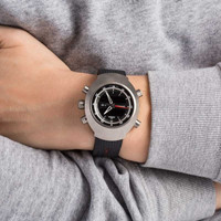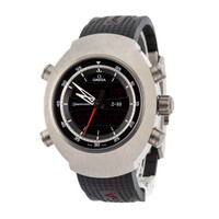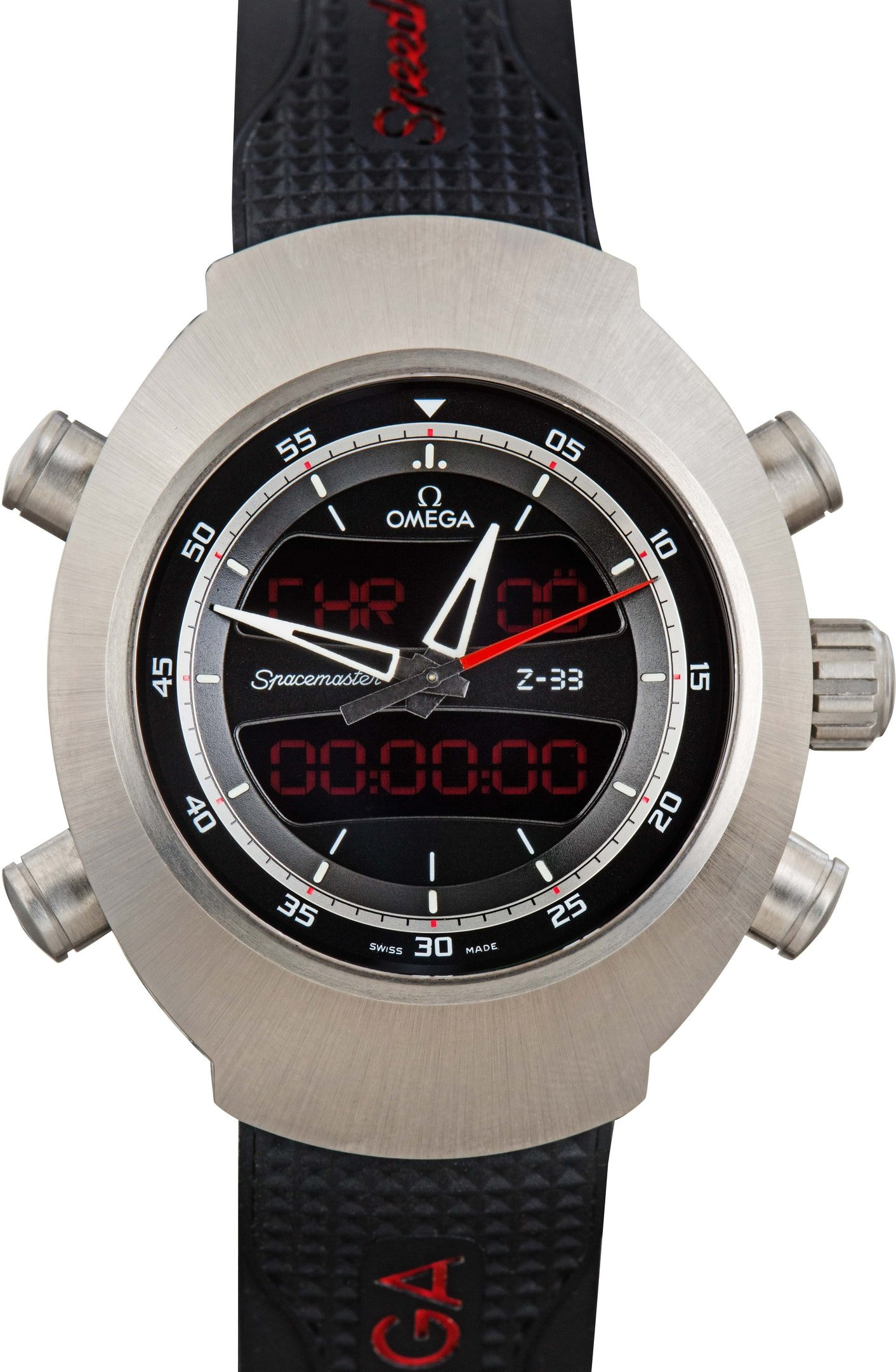 Why We Love This Watch This Omega Speedmaster Spacemaster Z-33 merges the heritage of the iconic "Pilot Line" case with advanced technology, powered by the Caliber 5666 multifunction quartz movement. Its analog hands float above a digital display, controlled via the crown at 3 o’clock, while four pushers manage functions like UTC, dual time zones, perpetual calendar, alarm, chronograph, and countdown timer. Designed for aviation professionals, it logs up to ten flights with date-hour indications. Encased in durable grade 5 titanium and paired with a black rubber strap, this timepiece delivers a bold, high-tech aesthetic. WATCH DETAILS CREDIT CARD PRICE $3,699.26 BRAND OMEGA MODEL NAME Speedmaster MODEL NUMBER 325.92.43.79.01.001 YEAR Circa 2012 ITEM NUMBER 172460 CONDITION Excellent GENDER Mens BOX & PAPERS Box Only CASE MATERIAL Titanium CRYSTAL Sapphire SIZE 43mm BEZEL Titanium Smooth SERIAL 91618XXX DIAL Black w/ Index hour markers, Luminous hands & Luminous lume MOVEMENT CALIBRE 5666 TYPE Quartz BEZEL Fixed COMPLICATION Chronograph BRACELET MATERIAL Rubber TYPE Rubber CLASP Foldover