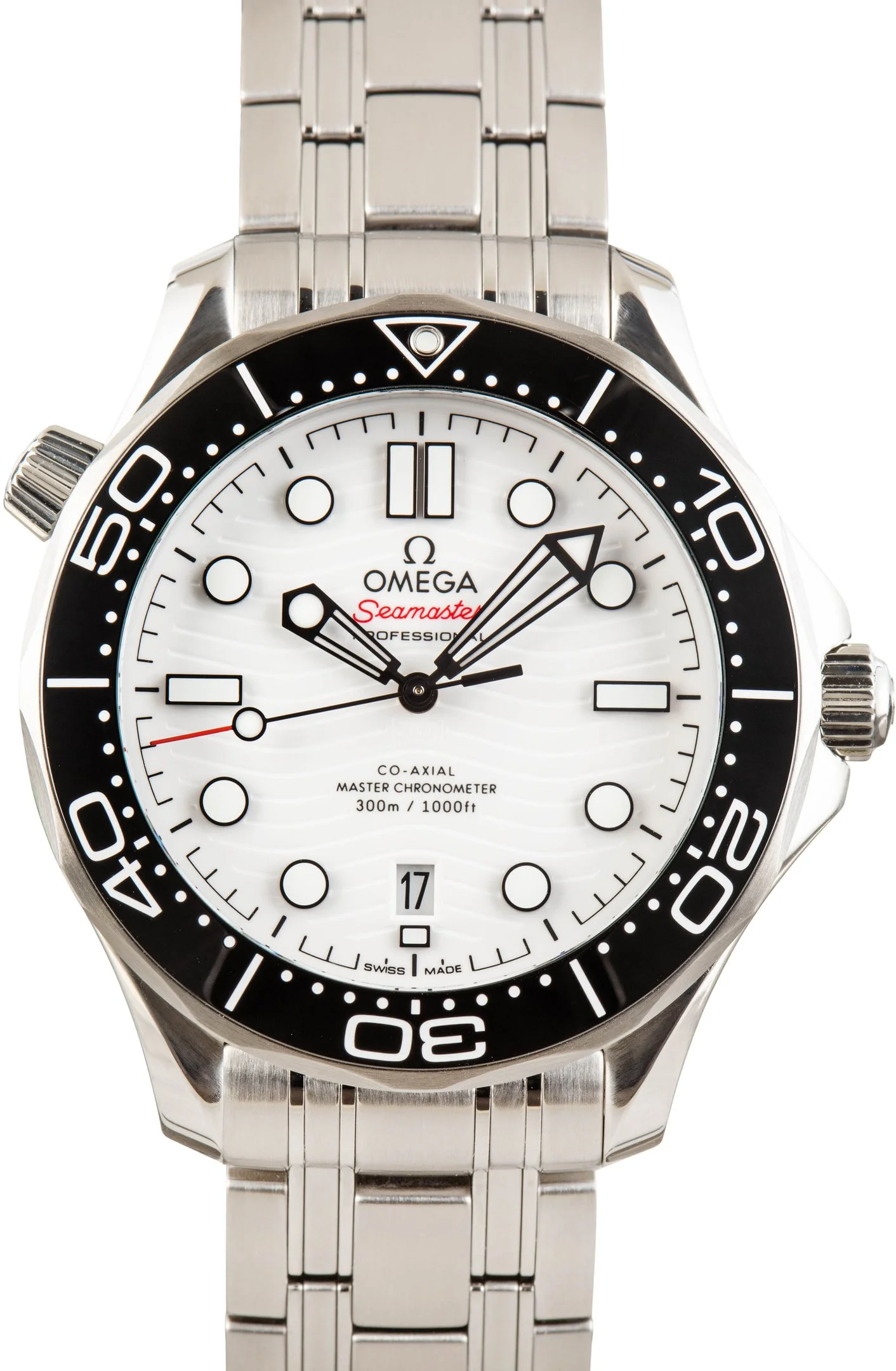 Why We Love This Watch This pre-owned Omega Seamaster Diver 300M ref. 210.30.42.20.04.001 (2020) continues the legacy of the iconic Diver 300M collection first introduced in 1993. Crafted in a 42mm stainless steel case, it features a black ceramic bezel with a white enamel diving scale and a polished white ceramic dial with laser-engraved waves and red Seamaster accents. Polished, blackened skeleton hands filled with white Super-LumiNova and a red-tipped seconds hand ensure excellent legibility, while the stainless steel bracelet and OMEGA Master Chronometer Calibre 8800—visible through the sapphire wave-edged caseback—deliver modern performance rooted in ocean-ready heritage. WATCH DETAILS BRAND OMEGA MODEL NAME Seamaster COLLECTION NAME Diver 300M MODEL NUMBER 210.30.42.20.04.001 YEAR 2020 ITEM NUMBER 181774 CONDITION Excellent GENDER Mens BOX & PAPERS Box and Papers CASE MATERIAL Stainless Steel CRYSTAL Sapphire SIZE 42MM BEZEL Ceramic Timing CASEBACK Exhibition SERIAL 83021XXX DIAL White w/ Luminous hour markers, Luminous hands & Luminous lume MOVEMENT CALIBRE 8800 TYPE Automatic BEZEL Unidirectional COMPLICATION Date BRACELET MATERIAL Stainless Steel CLASP Foldover