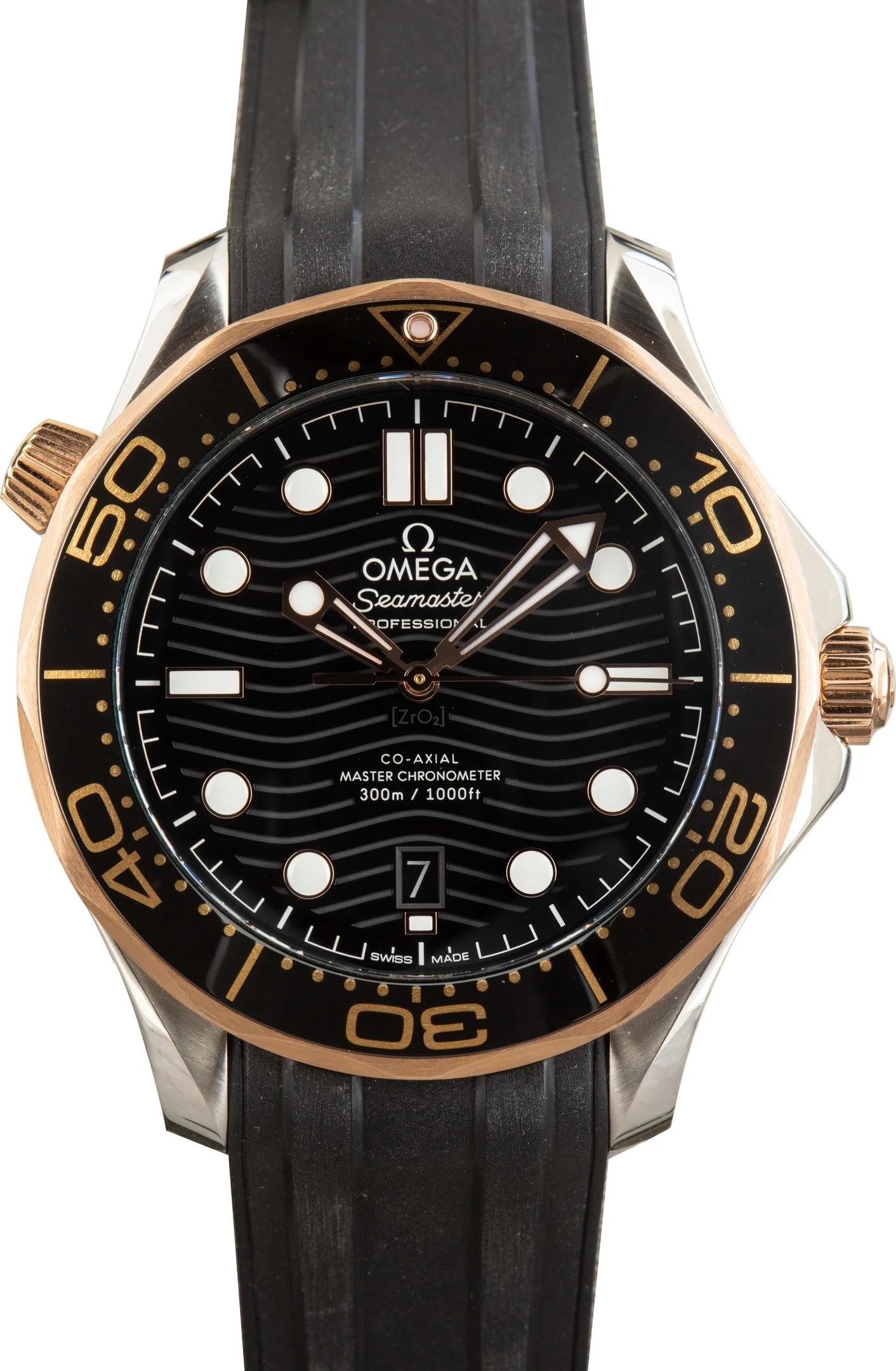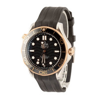 Why We Love This Watch This OMEGA Seamaster Diver 300M ref. 210.22.42.20.01.002 (2019 - 2025) combines functionality and elegance with a 42mm stainless steel case and an 18k Sedna™ gold bezel featuring a black ceramic timing insert. Its black wave-pattern luminous dial enhances underwater readability and adds a dynamic design element. Paired with a durable black rubber strap, this dive watch is powered by the reliable OMEGA Co-Axial Master Chronometer caliber 8800, ensuring precision and performance at depths of up to 300 meters. WATCH DETAILS CREDIT CARD PRICE $6,992.06 BRAND OMEGA MODEL NAME Seamaster COLLECTION NAME Diver 300M MODEL NUMBER 210.22.42.20.01.002 ITEM NUMBER 182297 CONDITION Excellent GENDER Mens BOX & PAPERS Box and Papers CASE MATERIAL Steel and Rose Gold CRYSTAL Sapphire SIZE 42MM BEZEL Ceramic Timing CASEBACK Exhibition SERIAL 89745XXX DIAL Black w/ Luminous hour markers, Luminous hands & Luminous lume MOVEMENT CALIBRE 8800 TYPE Automatic BEZEL Unidirectional COMPLICATION Date BRACELET MATERIAL Rubber TYPE Rubber CLASP Tang