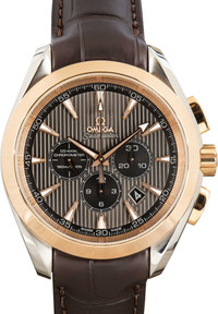 Why We Love This Watch This pre-owned Omega Seamaster Aqua Terra 150M ref. 231.23.44.50.06.001 features a 44mm stainless steel case with an 18K red gold bezel, paired with a brown leather strap for a refined yet robust look. The grey Teak Concept dial, inspired by luxury sailboat decks, includes a date window, 30-minute and 12-hour chronograph counters, and a small seconds subdial for balanced functionality. Protected by a sapphire crystal and water-resistant to 150 meters, this chronograph is powered by the Omega Co-Axial Calibre 3313, visible through a transparent caseback and certified as a chronometer for precision performance. WATCH DETAILS BRAND OMEGA MODEL NAME Seamaster COLLECTION NAME Aqua Terra MODEL NUMBER 231.23.44.50.06.001 ITEM NUMBER 183653 CONDITION Excellent GENDER Womens BOX & PAPERS Box and Papers CASE MATERIAL Steel and Rose Gold CRYSTAL Sapphire SIZE 44MM BEZEL 18k Rose Gold Smooth CASEBACK Exhibition SERIAL 78533XXX DIAL Slate w/ Index hour markers, Luminous hands & Luminous lume MOVEMENT CALIBRE 3313 TYPE Automatic BEZEL Fixed COMPLICATION Chronograph BRACELET MATERIAL Leather TYPE Leather CLASP Foldover