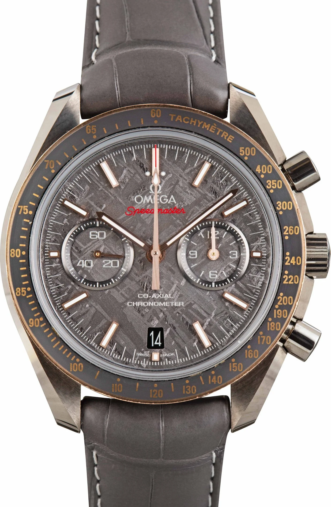 Why We Love This Watch This used Omega Speedmaster Dark Side of the Moon ref. 311.63.44.51.99.001 (2023) features a 44.25mm grey ceramic case with 18K Sedna gold Moonwatch-style hands, a Sedna gold bezel with a silicon nitride ring, and a brushed ceramic tachymeter scale. Its meteorite dial, acid-etched from solid extra-terrestrial stone, includes a small seconds sub-dial at 9 o’clock and 60-minute and 12-hour chronograph counters at 3 o’clock. Powered by the Co-Axial Calibre 9300 visible through a beveled sapphire caseback, and finished on a grey leather strap with titanium foldover clasp, this timepiece blends rare material artistry with professional chronograph performance. WATCH DETAILS BRAND OMEGA MODEL NAME Speedmaster MODEL NUMBER 311.63.44.51.99.001 YEAR 2023 ITEM NUMBER 182844 CONDITION Excellent GENDER Mens BOX & PAPERS Box and Papers CASE MATERIAL Ceramic CRYSTAL Sapphire SIZE 45MM BEZEL 18k Rose Gold Tachymetric CASEBACK Exhibition SERIAL 88409XXX DIAL Meteorite w/ Index hour markers, Luminous hands & Luminous lume MOVEMENT CALIBRE 9300 TYPE Automatic BEZEL Fixed COMPLICATION Chronograph BRACELET MATERIAL Leather TYPE Leather CLASP Foldover