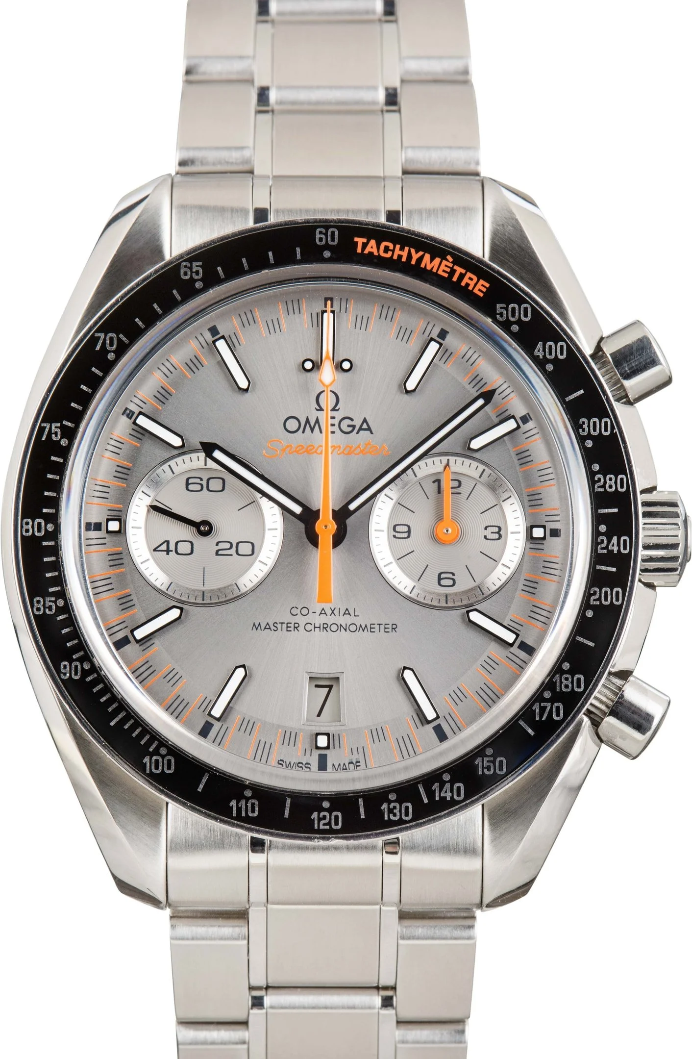 Why We Love This Watch This pre-owned Omega Speedmaster Racing ref. 329.30.44.51.06.001 combines sporty aesthetics with precision engineering. The 44.25mm stainless steel case and bracelet are complemented by a black ceramic bezel featuring the iconic tachymeter scale in bold orange lettering with Liquidmetal™ numerals. Its sun-brushed grey dial showcases a distinctive racing-style minute track, two subdials with rhodium-plated applied rings, and a subtle date window at 6 o’clock. The hands alternate between blackened and varnished orange, while the arrowhead indexes are blackened and filled with white Super-LumiNova for optimal legibility. Powered by the OMEGA Co-Axial Master Chronometer Calibre 9900, certified by METAS to the highest standard, this Speedmaster Racing delivers exceptional performance and unmistakable style for enthusiasts and collectors alike. WATCH DETAILS BRAND OMEGA MODEL NAME Speedmaster COLLECTION NAME Racing MODEL NUMBER 329.30.44.51.06.001 ITEM NUMBER 185322 CONDITION Excellent GENDER Mens BOX & PAPERS Box and Papers CASE MATERIAL Stainless Steel CRYSTAL Sapphire SIZE 45MM BEZEL Ceramic Tachymetric CASEBACK Exhibition SERIAL 89293XXX DIAL Slate w/ Index hour markers, Luminous hands & Luminous lume MOVEMENT CALIBRE 9900 TYPE Automatic BEZEL Fixed COMPLICATION Chronograph BRACELET MATERIAL Stainless Steel CLASP Foldover