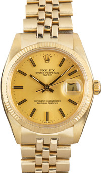 Why We Love This Watch This used Rolex Date ref 1503 (1973) is a classic expression of timeless luxury, featuring a 34mm 14k yellow gold case with a fluted bezel and a champagne index dial. Powered by the Rolex Caliber 1570, it delivers reliable precision and durability. Paired with a matching Jubilee bracelet, this vintage Rolex embodies refined elegance with a distinctive presence on the wrist. WATCH DETAILS BRAND Rolex MODEL NAME Date MODEL NUMBER 1503 YEAR 1973 ITEM NUMBER 180880 CONDITION Vintage GENDER Mens Womens Unisex BOX & PAPERS Box Only CASE MATERIAL Yellow Gold CRYSTAL Acrylic SIZE 34MM BEZEL 14k Yellow Gold Fluted CASEBACK Solid SERIAL 3255XXX DIAL Champagne w/ Index hour markers, Tritium hands & Tritium lume MOVEMENT CALIBRE 1570 TYPE Automatic BEZEL Fixed COMPLICATION Date BRACELET MATERIAL Yellow Gold TYPE Jubilee CLASP Oysterclasp