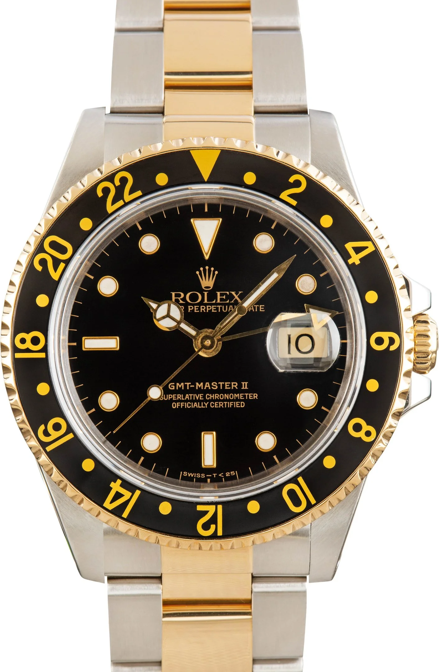 Why We Love This Watch This Rolex GMT Master II ref. 16713 (1991) showcases a 40mm stainless steel case accented by an 18k yellow gold bezel with a black GMT insert, offering both functionality and elegance. The black tritium dial ensures excellent readability in low-light conditions, while the two-tone Oyster bracelet adds a touch of sophistication. Powered by the reliable Caliber 3185, this timepiece combines dual-time functionality with iconic design, making it a standout for travelers and collectors alike. WATCH DETAILS BRAND Rolex MODEL NAME GMT-Master II COLLECTION GMT-Master MODEL NUMBER 16713 YEAR 1991 ITEM NUMBER 181725 CONDITION Excellent GENDER Mens BOX & PAPERS No Box or Papers CASE MATERIAL Steel and Gold CRYSTAL Sapphire SIZE 40MM BEZEL Aluminum 24-hour CASEBACK Solid SERIAL N312XXX DIAL Black w/ Tritium hour markers, Tritium hands & Tritium lume MOVEMENT CALIBRE 3185 TYPE Automatic BEZEL Bidirectional COMPLICATION Date BRACELET MATERIAL Two-Tone TYPE Oyster CLASP Fliplock