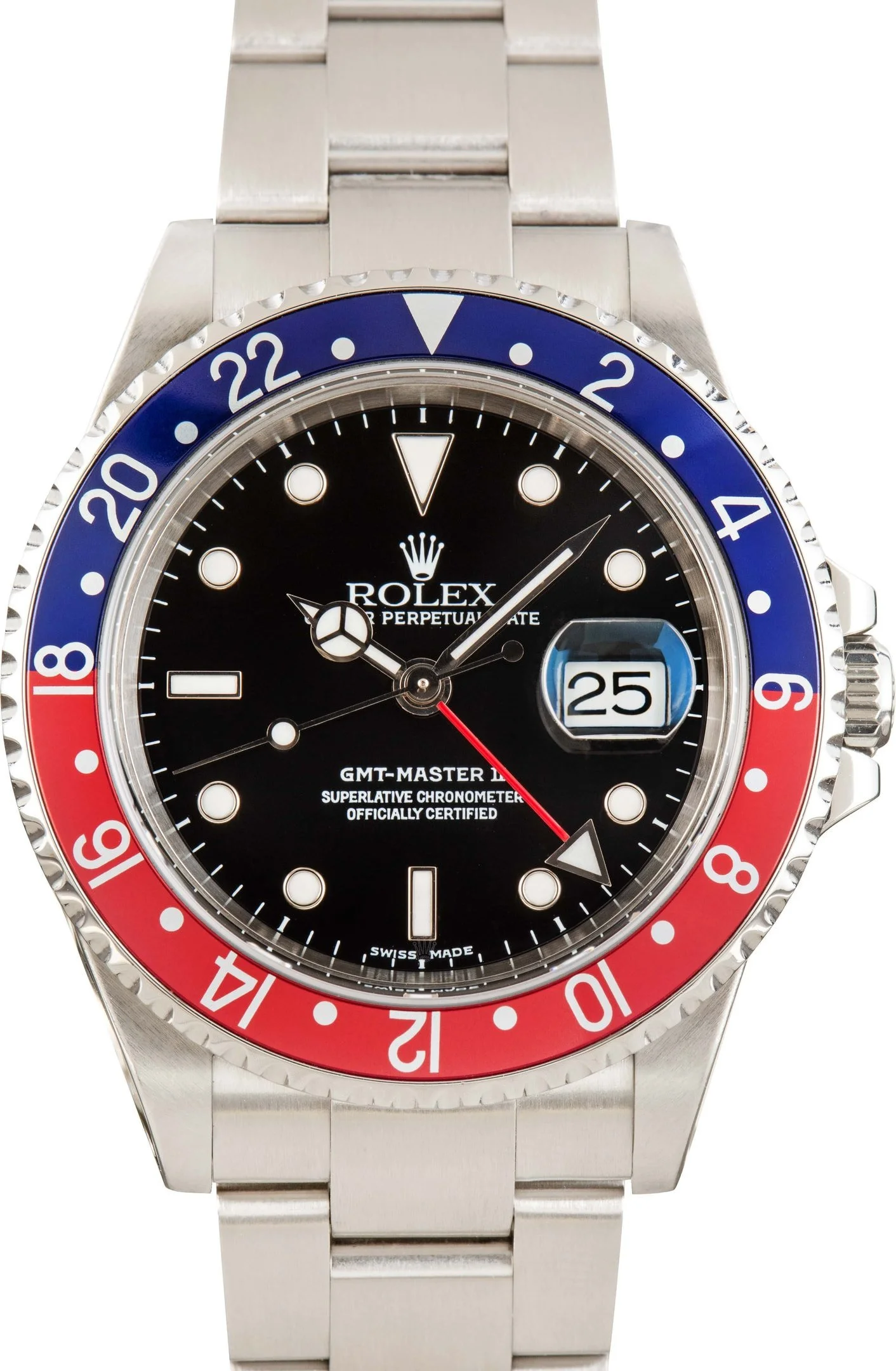 Why We Love This Watch This used Rolex GMT-Master II ref. 16710 (2000 - 2001) embodies the classic GMT design with a 40mm stainless steel case and the iconic blue-and-red "Pepsi" aluminum bezel. Its black Super-Luminova dial ensures excellent legibility, while the robust Oyster bracelet provides durability and comfort. Powered by the Caliber 3185 movement, it delivers precise timekeeping along with dual time zone functionality, making it a quintessential choice for collectors and globetrotters alike. WATCH DETAILS CREDIT CARD PRICE $16,253.06 BRAND Rolex MODEL NAME GMT-Master II COLLECTION GMT-Master MODEL NUMBER 16710 NICKNAME Pepsi YEAR 2001 ITEM NUMBER 182006 NAP CONDITION Excellent GENDER Mens BOX & PAPERS No Box or Papers CASE MATERIAL Stainless Steel CRYSTAL Sapphire SIZE 40MM BEZEL Aluminum 24-hour CASEBACK Solid SERIAL K439XXX DIAL Black w/ Luminous hour markers, Superluminova hands & Superluminova lume MOVEMENT CALIBRE 3185 TYPE Automatic BEZEL Bidirectional COMPLICATION Date BRACELET MATERIAL Stainless Steel TYPE Oyster CLASP Fliplock