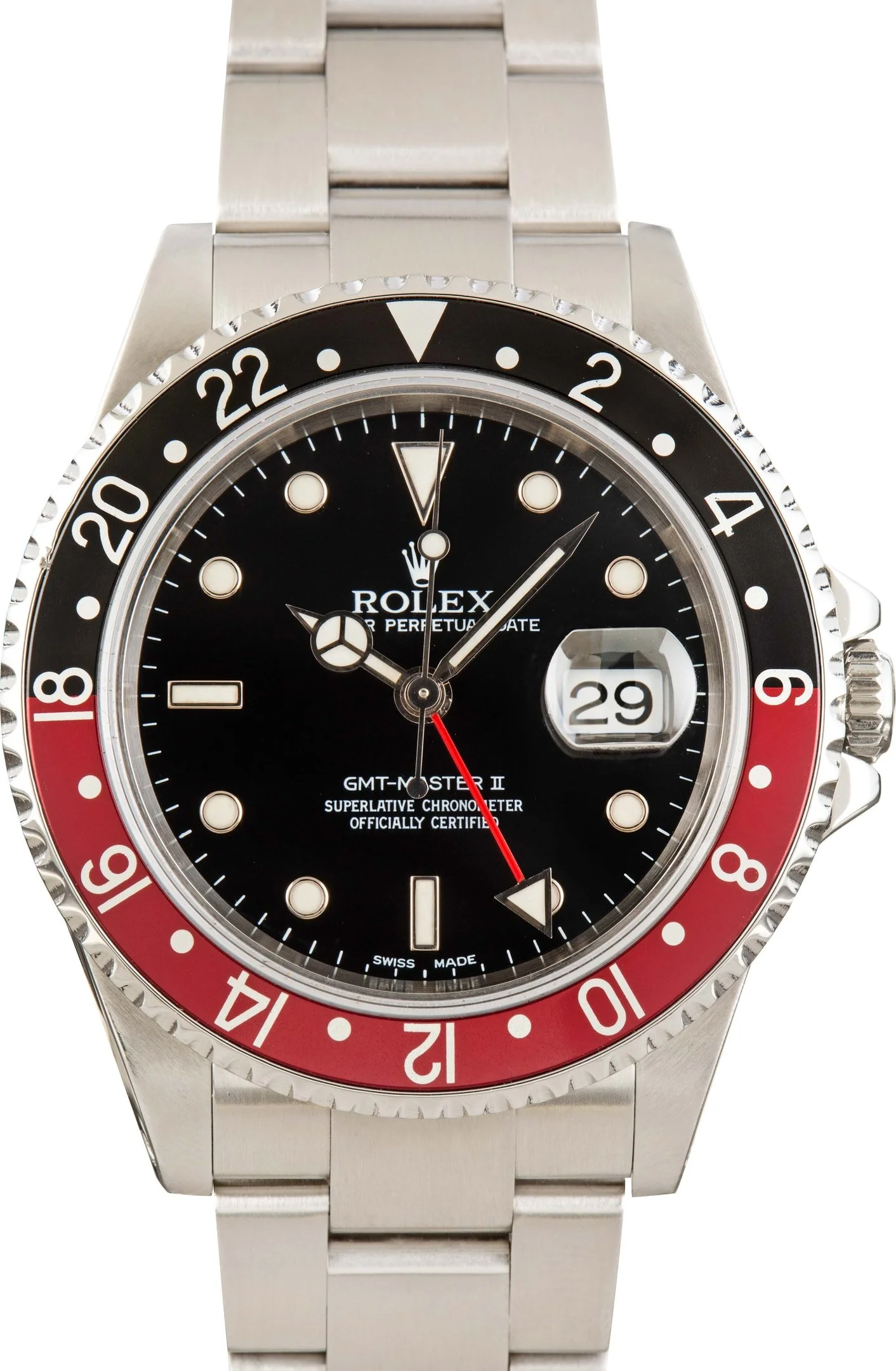 Why We Love This Watch This used Rolex GMT-Master II ref. 16710 (2000 - 2001) features a 40mm stainless steel case with a black superluminova dial. The watch is distinguished by its iconic red and black "Coke" bezel. It is paired with a stainless steel Oyster bracelet and is powered by the Rolex Caliber 3185. WATCH DETAILS BRAND Rolex MODEL NAME GMT-Master II COLLECTION GMT-Master MODEL NUMBER 16710 NICKNAME Coke YEAR 2001 ITEM NUMBER 182182 CONDITION Excellent GENDER Mens BOX & PAPERS Box Only CASE MATERIAL Stainless Steel CRYSTAL Sapphire SIZE 40MM BEZEL Aluminum 24-hour CASEBACK Solid SERIAL K339XXX DIAL Black w/ Luminous hour markers, Superluminova hands & Superluminova lume MOVEMENT CALIBRE 3185 TYPE Automatic BEZEL Bidirectional COMPLICATION Date BRACELET MATERIAL Stainless Steel TYPE Oyster CLASP Fliplock