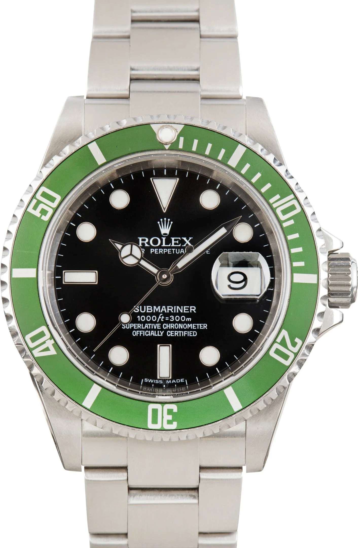 Why We Love This Watch This Rolex Submariner ref. 16610LV (2006 - 2007) features a 40mm stainless steel case with a green timing bezel and a black superluminova dial. It comes with an oyster bracelet and is powered by the 3135 movement, blending iconic design with modern functionality. WATCH DETAILS BRAND Rolex MODEL NAME Submariner MODEL NUMBER 16610 NICKNAME Kermit YEAR 2007 ITEM NUMBER 183358 CONDITION Excellent GENDER Mens BOX & PAPERS No Box or Papers CASE MATERIAL Stainless Steel CRYSTAL Sapphire SIZE 40MM BEZEL Aluminum Timing CASEBACK Solid SERIAL Z999XXX DIAL Black w/ Luminous hour markers, Superluminova hands & Superluminova lume MOVEMENT CALIBRE 3135 TYPE Automatic BEZEL Unidirectional COMPLICATION Date BRACELET MATERIAL Stainless Steel TYPE Oyster CLASP Fliplock