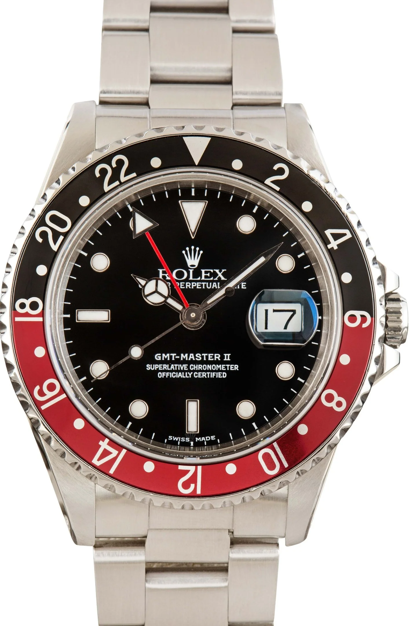 Why We Love This Watch This used Rolex GMT-Master II ref. 16710 (1987 - 1988) features a 40mm stainless steel case with a black service dial. The watch is distinguished by its iconic red and black "Coke" bezel. It is paired with a stainless steel Oyster bracelet and is powered by the Rolex Caliber 3185. WATCH DETAILS BRAND Rolex MODEL NAME GMT-Master II COLLECTION GMT-Master MODEL NUMBER 16710 NICKNAME Coke YEAR 1988 ITEM NUMBER 183581 CONDITION Excellent GENDER Mens BOX & PAPERS No Box or Papers CASE MATERIAL Stainless Steel CRYSTAL Sapphire SIZE 40MM BEZEL Aluminum 24-hour CASEBACK Solid SERIAL R714XXX DIAL Black w/ Luminous hour markers, Luminous hands & Luminous lume MOVEMENT CALIBRE 3185 TYPE Automatic BEZEL Bidirectional COMPLICATION Date BRACELET MATERIAL Stainless Steel TYPE Oyster CLASP Oysterclasp