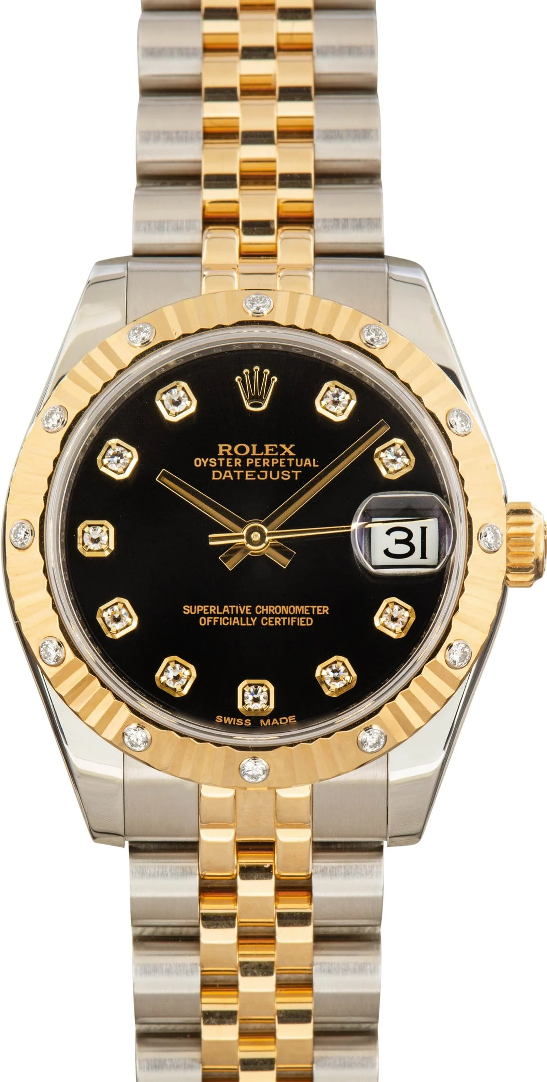 Why We Love This Watch This used Rolex Datejust 31 ref. 178313 (circa 2017) features a black dial set with diamond hour markers and date display at 3 o’clock, housed in a 31mm stainless steel and 18k yellow gold case with a diamond-set yellow gold bezel. Powered by the Rolex 2236 automatic movement and paired with a two-tone Jubilee bracelet, this Datejust delivers refined luxury, modern performance, and unmistakable Rolex elegance. WATCH DETAILS CREDIT CARD PRICE $16,458.86 BRAND Rolex MODEL NAME Datejust 31 COLLECTION Datejust MODEL NUMBER 178313 YEAR 2017 ITEM NUMBER 185268 CONDITION Excellent GENDER Womens BOX & PAPERS Box and Papers CASE MATERIAL Steel and Gold CRYSTAL Sapphire SIZE 31MM BEZEL 18k Yellow Gold Diamond CASEBACK Solid SERIAL 698T4XXX DIAL Black Diamond w/ Diamond hour markers, Nonluminous hands & Nonluminous lume MOVEMENT CALIBRE 2235 TYPE Automatic BEZEL Fixed COMPLICATION Date BRACELET MATERIAL Two-Tone TYPE Jubilee CLASP Concealed folding Crownclasp