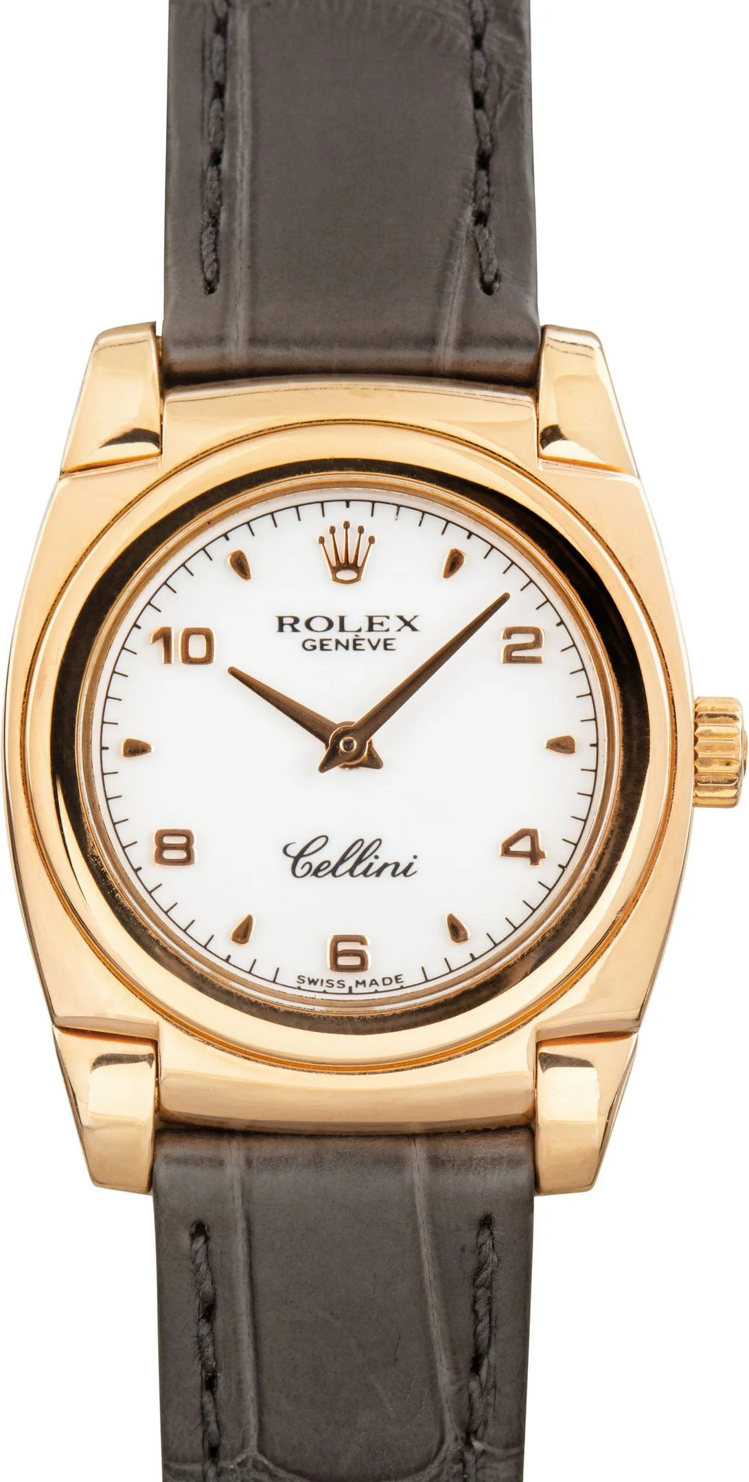 Why We Love This Watch This pre-owned Rolex Cellini ref. 5310 (1999) showcases refined simplicity in a 26mm 18k Everose gold case with a smooth bezel. The white dial features elegant Arabic numerals and slender gold hands, offering a classic and understated design. Fitted on a Rolex grey alligator strap, this Cellini blends traditional craftsmanship with modern elegance. Powered by a precise quartz movement, this watch delivers reliable performance and timeless style within Rolex’s distinguished dress collection. WATCH DETAILS CREDIT CARD PRICE $7,197.86 BRAND Rolex MODEL NAME Cellini MODEL NUMBER 5310 YEAR 1999 ITEM NUMBER 184614 CONDITION Excellent GENDER Womens BOX & PAPERS No Box or Papers CASE MATERIAL Rose Gold CRYSTAL Sapphire SIZE 26MM BEZEL 18k Rose Gold Smooth CASEBACK Solid SERIAL A847XXX DIAL White w/ Arabic hour markers, Non-Luminous hands & Nonluminous lume MOVEMENT CALIBRE Quartz TYPE Quartz BEZEL Fixed BRACELET MATERIAL Leather TYPE Rolex Leather Strap CLASP Tang Buckle