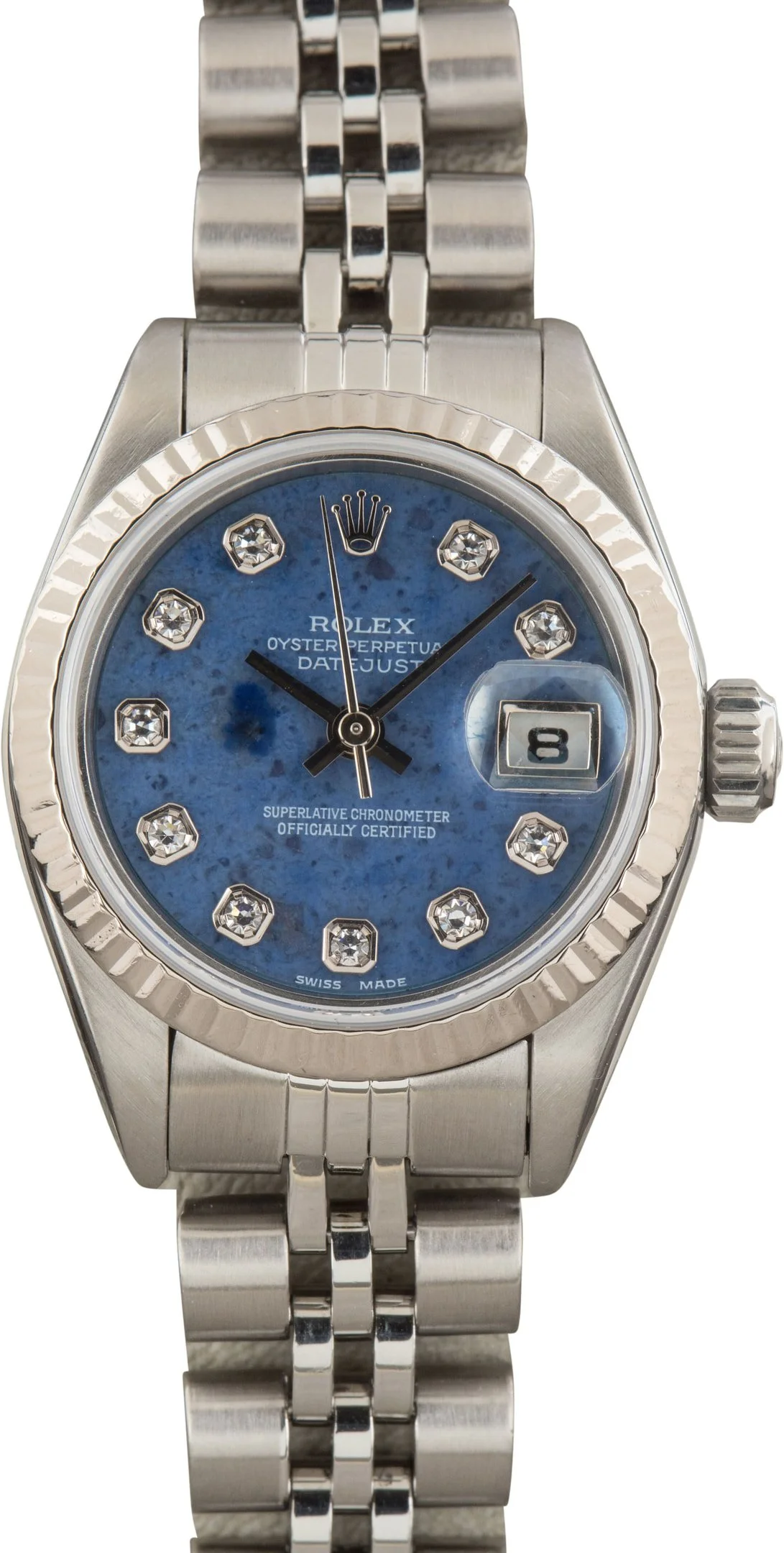 Why We Love This Watch This pre-owned 2000 Rolex Datejust ref. 79174 exudes refined elegance and classic Rolex sophistication. A striking sodalite diamond dial adds vibrant color and luxurious sparkle, beautifully complemented by a stainless steel case and Jubilee bracelet for a balanced, graceful presence on the wrist. Timeless in design and versatile in wear, this Ladies Datejust is a distinguished choice for collectors and enthusiasts seeking a statement piece with enduring appeal. WATCH DETAILS BRAND Rolex MODEL NAME Lady Datejust COLLECTION Datejust MODEL NUMBER 79174 YEAR 2000 ITEM NUMBER 183640 CONDITION Excellent GENDER Womens BOX & PAPERS Box and Papers/Card CASE MATERIAL Stainless Steel CRYSTAL Sapphire SIZE 26MM BEZEL 18k White Gold Fluted CASEBACK Solid SERIAL P990XXX DIAL Blue Diamond w/ Diamond hour markers, Nonluminous hands & Nonluminous lume MOVEMENT CALIBRE 2235 TYPE Automatic BEZEL Fixed COMPLICATION Date BRACELET MATERIAL Stainless Steel TYPE Jubilee CLASP Oysterclasp