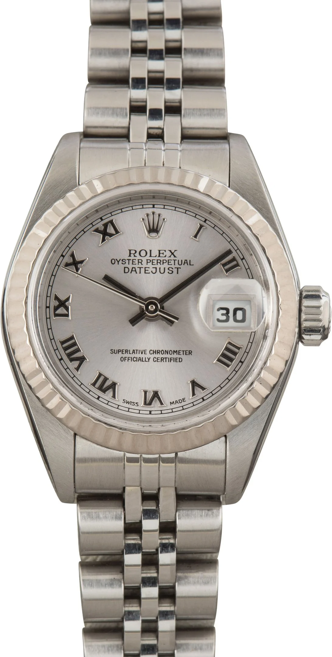 Why We Love This Watch This pre-owned 2000 Rolex Datejust ref. 79174 showcases timeless elegance in a refined, classic design. A rhodium dial with Roman numeral hour markers is complemented by an 18k white gold fluted bezel, while a signature Jubilee bracelet provides comfort and a graceful wrist presence. Combining sophisticated styling with enduring Rolex craftsmanship, this Ladies Datejust is a versatile and distinguished choice for collectors and enthusiasts alike. WATCH DETAILS BRAND Rolex MODEL NAME Lady Datejust COLLECTION Datejust MODEL NUMBER 79174 YEAR 2000 ITEM NUMBER 184334 CONDITION Excellent GENDER Womens BOX & PAPERS Box and Papers CASE MATERIAL Stainless Steel CRYSTAL Sapphire SIZE 26MM BEZEL 18k White Gold Fluted CASEBACK Solid SERIAL P858XXX DIAL Rhodium w/ Roman hour markers, Nonluminous hands & Nonluminous lume MOVEMENT CALIBRE 2235 TYPE Automatic BEZEL Fixed COMPLICATION Date BRACELET MATERIAL Stainless Steel TYPE Jubilee CLASP Oysterclasp