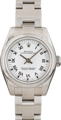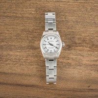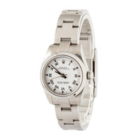 Why We Love This Watch Pre-owned Lady Rolex Oyster Perpetual ref. 176200 (2007–2008) is a refined expression of sporty elegance. Featuring a crisp white dial with a unique combination of black Roman numerals and luminous index hour markers, this 26mm model pairs seamlessly with a smooth bezel and classic Oyster bracelet. A timeless and versatile choice for everyday sophistication. WATCH DETAILS BRAND Rolex MODEL NAME Oyster Perpetual 26 MODEL NUMBER 176200 YEAR 2008 ITEM NUMBER 180729 CONDITION Excellent GENDER Womens BOX & PAPERS Box and Papers CASE MATERIAL Stainless Steel CRYSTAL Sapphire SIZE 26MM BEZEL Stainless Steel Engine Turned SERIAL M003XXX DIAL Slate w/ Roman hour markers, Nonluminous hands & Nonluminous lume MOVEMENT CALIBRE 2231 TYPE Automatic BEZEL Fixed COMPLICATION No Date BRACELET MATERIAL Stainless Steel TYPE Oyster CLASP Oysterclasp