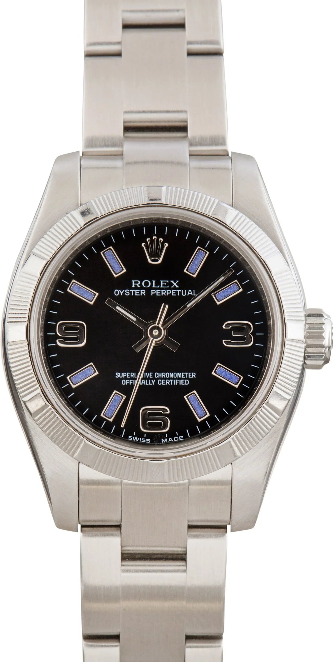 Why We Love This Watch This used Lady Rolex Oyster Perpetual ref. 176200 (2006 - 2007) features a 26mm stainless steel case with a black dial, Arabic numeral hour markers, and lilac index markers for a subtle pop of color. Powered by the automatic Caliber 2231 movement, it delivers precise and reliable timekeeping. Completing this elegant everyday watch is a stainless steel Oyster bracelet with Oysterclasp, along with a scratch-resistant sapphire crystal and 100m (330ft) water resistance, combining timeless style with durable functionality. WATCH DETAILS BRAND Rolex MODEL NAME Oyster Perpetual 26 COLLECTION Oyster Perpetual MODEL NUMBER 176210 YEAR 2007 ITEM NUMBER 183523 CONDITION Excellent GENDER Womens BOX & PAPERS No Box or Papers CASE MATERIAL Stainless Steel CRYSTAL Sapphire SIZE 26MM BEZEL Stainless Steel Engine Turned CASEBACK Solid SERIAL Z775XXX DIAL Black w/ Arabic hour markers, Superluminova hands & Superluminova lume MOVEMENT CALIBRE 2231 TYPE Automatic BEZEL Fixed COMPLICATION No Date BRACELET MATERIAL Stainless Steel TYPE Oyster CLASP Oysterclasp