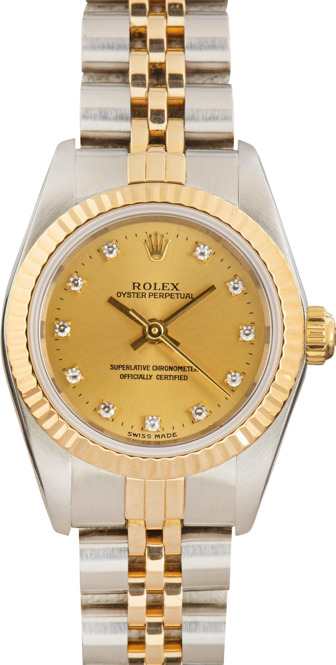 Why We Love This Watch Exuding refined elegance, this 2000–2001 Ladies Rolex Oyster Perpetual ref. 76193 is the epitome of timeless sophistication. Crafted in a harmonious blend of stainless steel and yellow gold, the 24mm case beautifully frames a champagne dial adorned with brilliant diamond hour markers. Paired with a graceful Jubilee bracelet, this exquisite timepiece offers a perfect balance of understated luxury and classic Rolex heritage—ideal for those who appreciate distinguished style in a more delicate, compact form. WATCH DETAILS CREDIT CARD PRICE $7,197.86 BRAND Rolex MODEL NAME Oyster Perpetual MODEL NUMBER 76193 YEAR 2001 ITEM NUMBER 173007 CONDITION Excellent GENDER Womens BOX & PAPERS No Box or Papers CASE MATERIAL Steel and Gold CRYSTAL Sapphire SIZE 24MM BEZEL 18k Yellow Gold Fluted SERIAL K446XXX DIAL Champagne Diamonds w/ Diamond hour markers, Non-Luminous hands & Nonluminous lume MOVEMENT CALIBRE 2230 TYPE Automatic BEZEL Fixed COMPLICATION No Date BRACELET MATERIAL Two-Tone TYPE Jubilee CLASP Oysterclasp