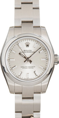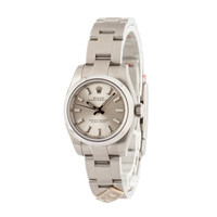 Why We Love This Watch This pre-owned Ladies Rolex Oyster Perpetual ref 176200 (2016) is a rare collector's gem, featuring the Domino’s Pizza logo on the bracelet link and caseback. Still factory stickered, this quirky twist on a classic offers timeless Rolex design with a stainless steel Oyster bracelet, smooth bezel, and silver Superluminova dial—all wrapped in a slice of corporate history. WATCH DETAILS CREDIT CARD PRICE $6,065.96 BRAND Rolex MODEL NAME Oyster Perpetual 26 MODEL NUMBER 176200 YEAR 2016 ITEM NUMBER 173618 CONDITION Excellent GENDER Womens BOX & PAPERS Box and Papers CASE MATERIAL Stainless Steel CRYSTAL Sapphire SIZE 26mm BEZEL Stainless Steel Smooth SERIAL 6491PXXX DIAL Silver w/ Index hour markers, Superluminova hands & Superluminova lume MOVEMENT CALIBRE 2231 TYPE Automatic BEZEL Fixed COMPLICATION No Date BRACELET MATERIAL Stainless Steel TYPE Oyster CLASP Oysterclasp