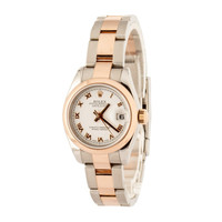 Why We Love This Watch This pre-owned Rolex Datejust ref. 179161, produced between 2005 and 2006, is a refined expression of elegance in a compact 26mm profile. Crafted from a blend of stainless steel and 18k Everose gold, it features a smooth bezel and a classic Oyster bracelet that effortlessly balances luxury and everyday wearability. Inside, the reliable Rolex Caliber 2235 movement offers precision timekeeping with a 48-hour power reserve. Timeless in design and built to last, this Datejust is the perfect choice for those who appreciate understated sophistication and enduring quality. WATCH DETAILS BRAND Rolex MODEL NAME Lady Datejust COLLECTION Datejust MODEL NUMBER 179161 YEAR 2006 ITEM NUMBER 172991 CONDITION Excellent GENDER Womens BOX & PAPERS Box Only CASE MATERIAL Steel and Rose Gold CRYSTAL Sapphire SIZE 26MM BEZEL 18k Rose Gold Smooth SERIAL D151XXX DIAL White w/ Roman hour markers, Non-Luminous hands & Nonluminous lume MOVEMENT CALIBRE 2235 TYPE Automatic BEZEL Fixed COMPLICATION Date BRACELET MATERIAL Two-Tone TYPE Oyster CLASP Oysterclasp