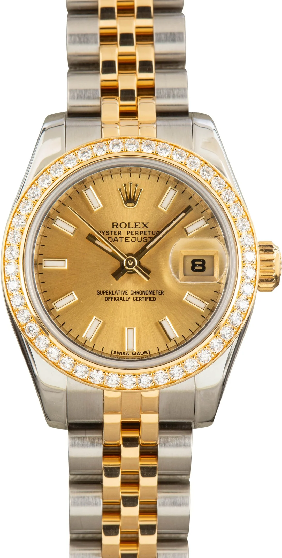 Why We Love This Watch This pre-owned Rolex Datejust 31 ref. 178383 (2010) brings together elegant design and subtle sparkle. Featuring a warm champagne dial with Super-LumiNova hands and index hour markers, it is framed by a diamond-set bezel that adds refined brilliance. Crafted in white gold with a Jubilee bracelet for comfort and style, this 31mm Datejust is a luxurious everyday watch with classic Rolex appeal. WATCH DETAILS CREDIT CARD PRICE $15,429.86 BRAND Rolex MODEL NAME Lady Datejust COLLECTION Datejust MODEL NUMBER 179383 YEAR 2010 ITEM NUMBER 184221 CONDITION Excellent GENDER Womens BOX & PAPERS Box and Papers CASE MATERIAL Steel and Gold CRYSTAL Sapphire SIZE 31MM BEZEL 18k Yellow Gold Diamond CASEBACK Solid SERIAL G473XXX DIAL Champagne w/ Index hour markers, Superluminova hands & Superluminova lume MOVEMENT CALIBRE 2235 TYPE Automatic BEZEL Fixed COMPLICATION Date BRACELET MATERIAL Two-Tone TYPE Jubilee CLASP Concealed folding Crownclasp