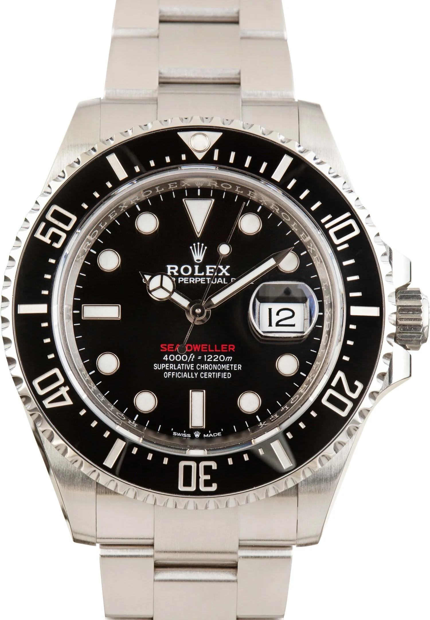 Why We Love This Watch This pre-owned Rolex Sea-Dweller ref 126600 (2021) is built for professional performance and deep-sea endurance. Its 43mm stainless steel case features a black ceramic timing bezel and a Chromalight dial for exceptional legibility in any environment. Powered by the Rolex Caliber 3235 automatic movement, it ensures outstanding precision, reliability, and a 70-hour power reserve. Completed with the robust Oyster bracelet, this Sea-Dweller embodies the perfect blend of technical excellence and iconic Rolex design. WATCH DETAILS CREDIT CARD PRICE $16,253.06 BRAND Rolex MODEL NAME Sea-Dweller MODEL NUMBER 126600 YEAR 2021 ITEM NUMBER 183085 CONDITION Excellent GENDER Mens BOX & PAPERS Box and Papers CASE MATERIAL Stainless Steel CRYSTAL Sapphire SIZE 43MM BEZEL Ceramic Timing CASEBACK Solid SERIAL 43W1WXXX DIAL Black w/ Luminous hour markers, Chromalight hands & Chromalight lume MOVEMENT CALIBRE 3235 TYPE Automatic BEZEL Unidirectional COMPLICATION Date BRACELET MATERIAL Stainless Steel TYPE Oyster CLASP Glidelock