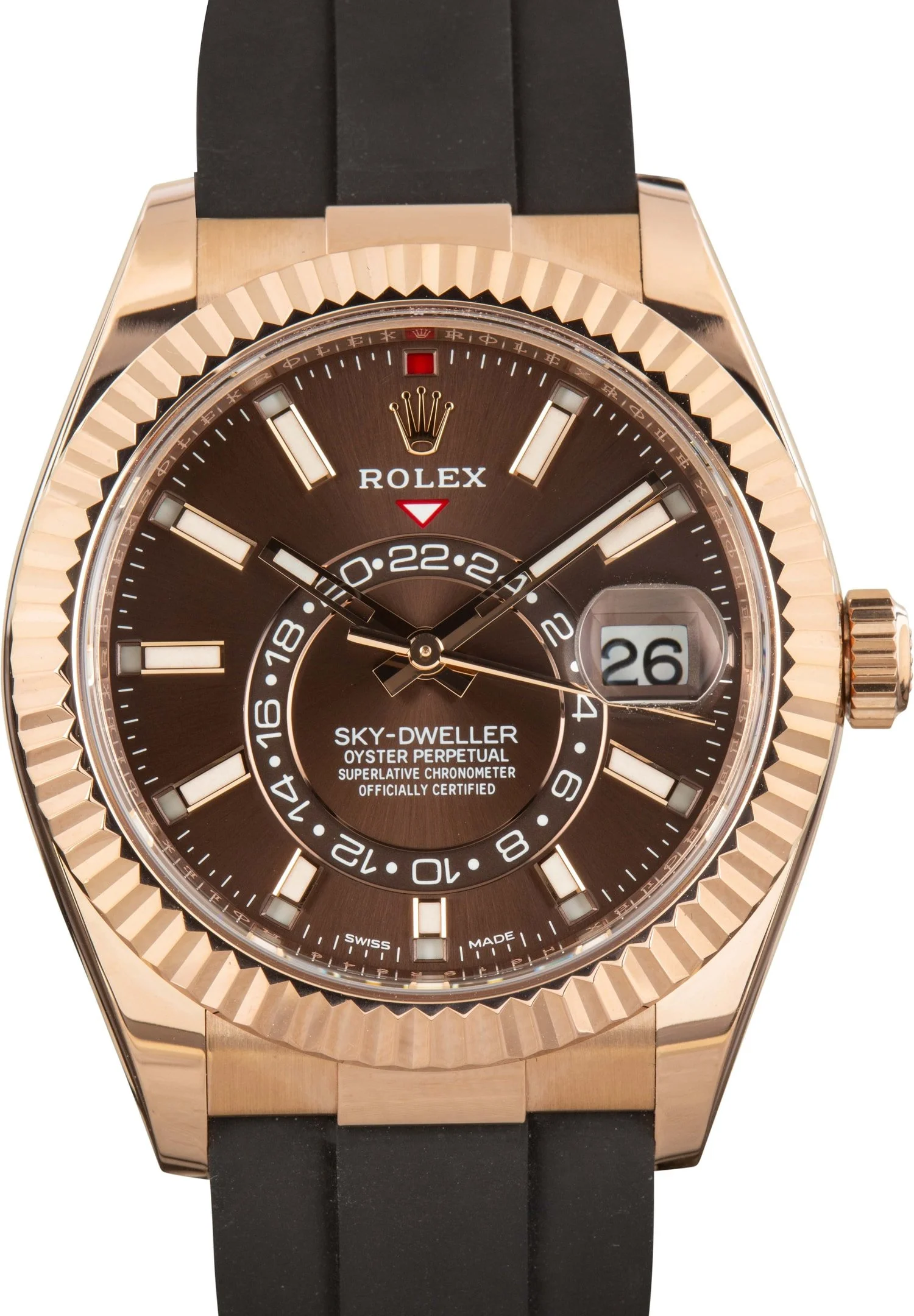 Why We Love This Watch This pre-owned Rolex Sky-Dweller ref. 326235 (2021) combines advanced functionality with refined luxury. Housed in a 42mm 18k Everose gold case, it features Rolex’s signature fluted bezel and a rich chocolate brown dial accented by luminous index hour markers and an off-center 24-hour disc for dual-time display. The integrated annual calendar with the Saros system ensures effortless date adjustment throughout the year. Powered by the Caliber 9001 automatic movement and fitted with a black Oysterflex strap, this Sky-Dweller offers exceptional comfort, precision, and sophistication—ideal for the modern traveler. WATCH DETAILS CREDIT CARD PRICE $38,685.26 BRAND Rolex MODEL NAME Sky-Dweller MODEL NUMBER 326235 YEAR 2021 ITEM NUMBER 184307 CONDITION Excellent GENDER Mens BOX & PAPERS Box and Papers CASE MATERIAL Rose Gold CRYSTAL Sapphire SIZE 42MM BEZEL 18k Rose Gold Fluted CASEBACK Solid SERIAL H619RXXX DIAL Brown w/ Index hour markers, Chromalight hands & Chromalight lume MOVEMENT CALIBRE 9001 TYPE Automatic BEZEL Positional COMPLICATION Date BRACELET MATERIAL Rubber TYPE Oysterflex CLASP Oysterlock