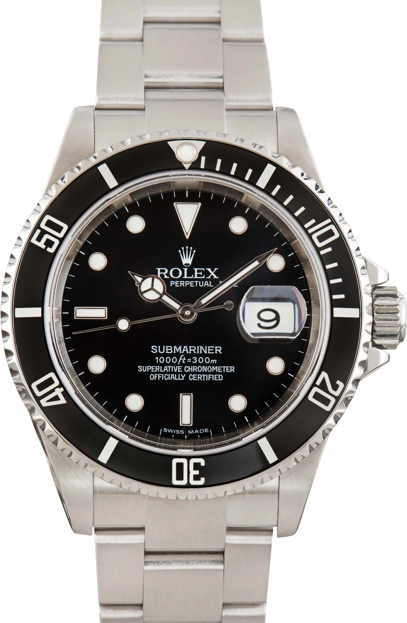 Why We Love This Watch This pre-owned Rolex Submariner ref 16610T (2007) features the desirable “no holes” case design, paired with a black dial and unidirectional black timing bezel. Crafted from stainless steel and powered by the reliable Rolex Caliber 3135 automatic movement, it delivers exceptional precision and durability. Combining classic dive watch heritage with modern refinement, this Submariner remains a timeless favorite among collectors and enthusiasts. WATCH DETAILS BRAND Rolex MODEL NAME Submariner MODEL NUMBER 16610 YEAR 2007 ITEM NUMBER 183220 CONDITION Excellent GENDER Mens BOX & PAPERS Box and Papers CASE MATERIAL Stainless Steel CRYSTAL Sapphire SIZE 40MM BEZEL Aluminum Timing CASEBACK Solid SERIAL Z215XXX DIAL Black w/ Luminous hour markers, Superluminova hands & Superluminova lume MOVEMENT CALIBRE 3135 TYPE Automatic BEZEL Unidirectional COMPLICATION Date BRACELET MATERIAL Stainless Steel TYPE Oyster CLASP Fliplock