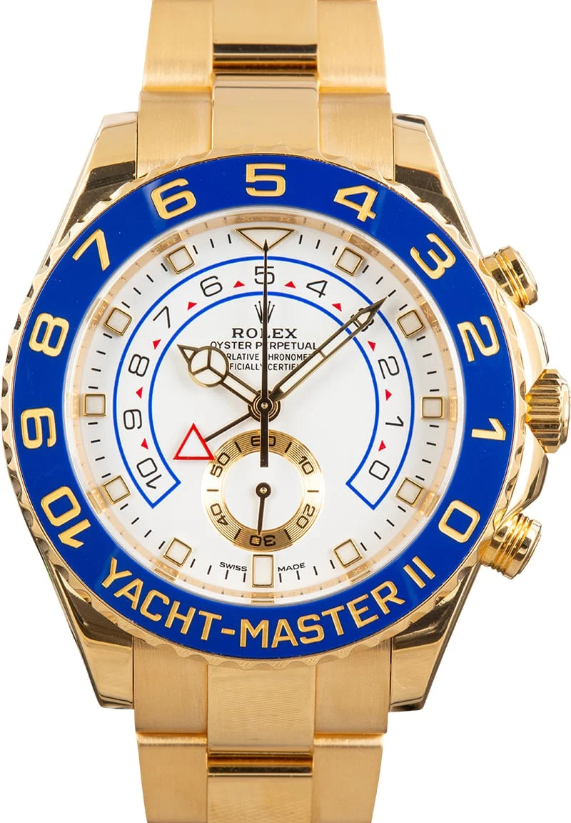 Why We Love This Watch This pre-owned Rolex Yacht-Master II ref. 116688 (2018) features a 44mm 18k yellow gold case with a blue Cerachrom bezel and a white index dial. Powered by the Caliber 4161 automatic movement, it offers precise regatta chronograph functionality. Fitted with an Oyster bracelet, this Yacht-Master II combines bold design, technical innovation, and unmistakable Rolex luxury. WATCH DETAILS CREDIT CARD PRICE $46,299.86 BRAND Rolex MODEL NAME Yacht-Master II COLLECTION Yacht-Master MODEL NUMBER 116688 YEAR 2018 ITEM NUMBER 184611 CONDITION Excellent GENDER Mens BOX & PAPERS Box and Papers CASE MATERIAL Yellow Gold CRYSTAL Sapphire SIZE 44MM BEZEL 18k Yellow Gold Ceramic CASEBACK Solid SERIAL M8H24XXX DIAL White w/ Luminous hour markers, Chromalight hands & Chromalight lume MOVEMENT CALIBRE 4161 TYPE Automatic BEZEL Positional COMPLICATION No Date BRACELET MATERIAL Yellow Gold TYPE Oyster CLASP Oysterlock