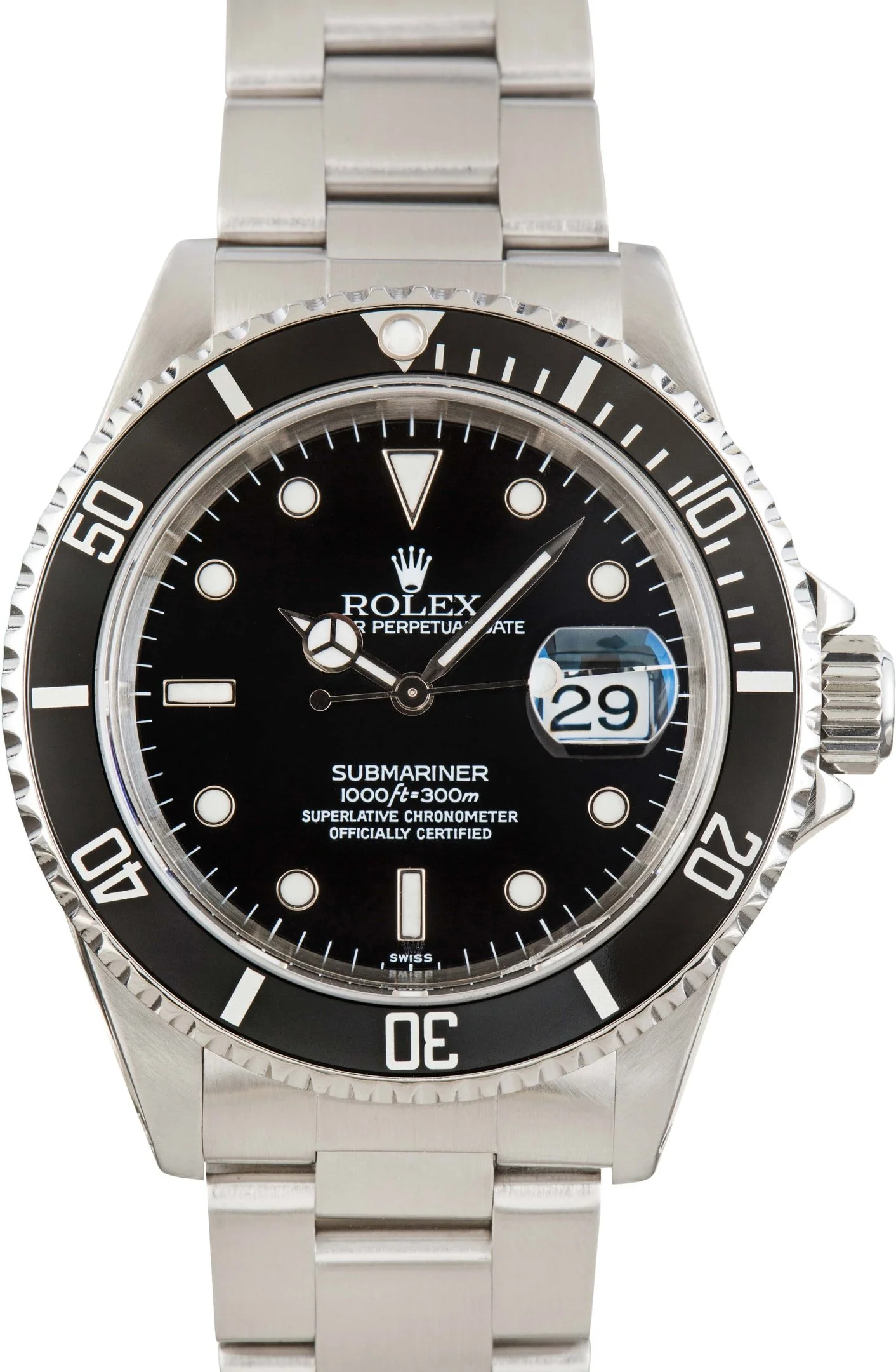 Why We Love This Watch This pre-owned Rolex Submariner ref. 16610 (1999) features a black Superluminova dial with a matching black timing bezel. The stainless steel case and Oyster bracelet provide durability and classic style, powered by the reliable Caliber 3135 automatic movement. WATCH DETAILS BRAND Rolex MODEL NAME Submariner MODEL NUMBER 16610 YEAR 1999 ITEM NUMBER 184370 CONDITION Excellent GENDER Mens BOX & PAPERS Box and Papers CASE MATERIAL Stainless Steel CRYSTAL Sapphire SIZE 40MM BEZEL Aluminum Timing CASEBACK Solid SERIAL A362XXX DIAL Black w/ Luminous hour markers, Luminous hands & Luminova lume MOVEMENT CALIBRE 3135 TYPE Automatic BEZEL Unidirectional COMPLICATION Date BRACELET MATERIAL Stainless Steel TYPE Oyster CLASP Fliplock