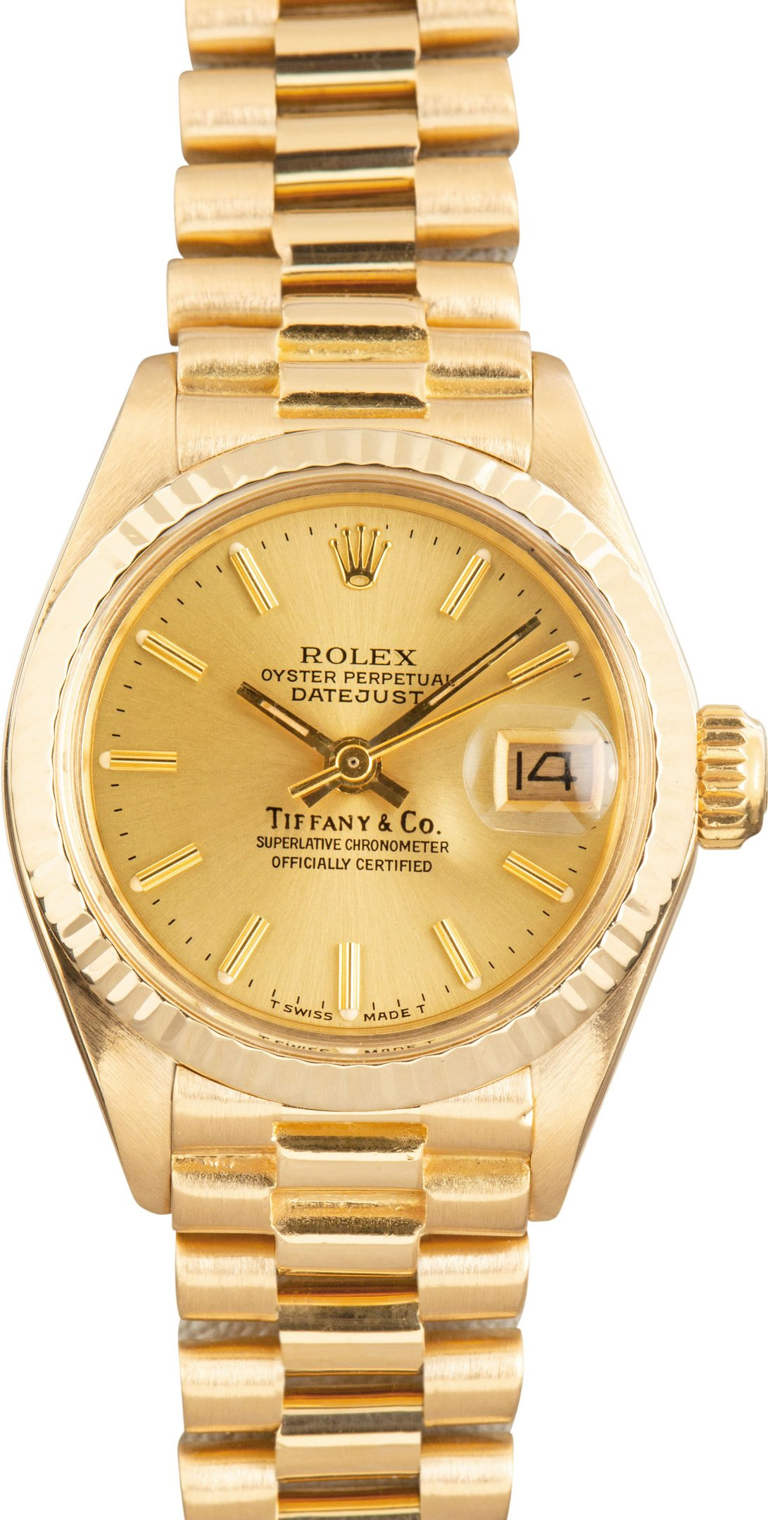 Why We Love This Watch This pre-owned Ladies Rolex Datejust ref 6917 (1975) showcases classic elegance in a 26mm 18k yellow gold case paired with a matching President bracelet. The warm champagne Tiffany & Co. dial features applied gold hour markers and a date window at 3 o’clock beneath the signature Cyclops lens. Powered by a self-winding automatic movement, this Lady Datejust blends timeless Rolex craftsmanship with refined style, making it a distinguished vintage timepiece for collectors and enthusiasts alike. WATCH DETAILS CREDIT CARD PRICE $10,799.36 BRAND Rolex MODEL NAME Lady Datejust COLLECTION Datejust MODEL NUMBER 6917 YEAR 1975 ITEM NUMBER 182853 CONDITION Excellent GENDER Womens BOX & PAPERS Box Only CASE MATERIAL Yellow Gold CRYSTAL Acrylic SIZE 26MM BEZEL 18k Yellow Gold Fluted CASEBACK Solid SERIAL 4100XXX DIAL Champagne w/ Index hour markers, Tritium hands & Tritium lume MOVEMENT CALIBRE 2030 TYPE Automatic BEZEL Fixed COMPLICATION Date BRACELET MATERIAL Yellow Gold TYPE President CLASP Concealed Folding Crownclasp