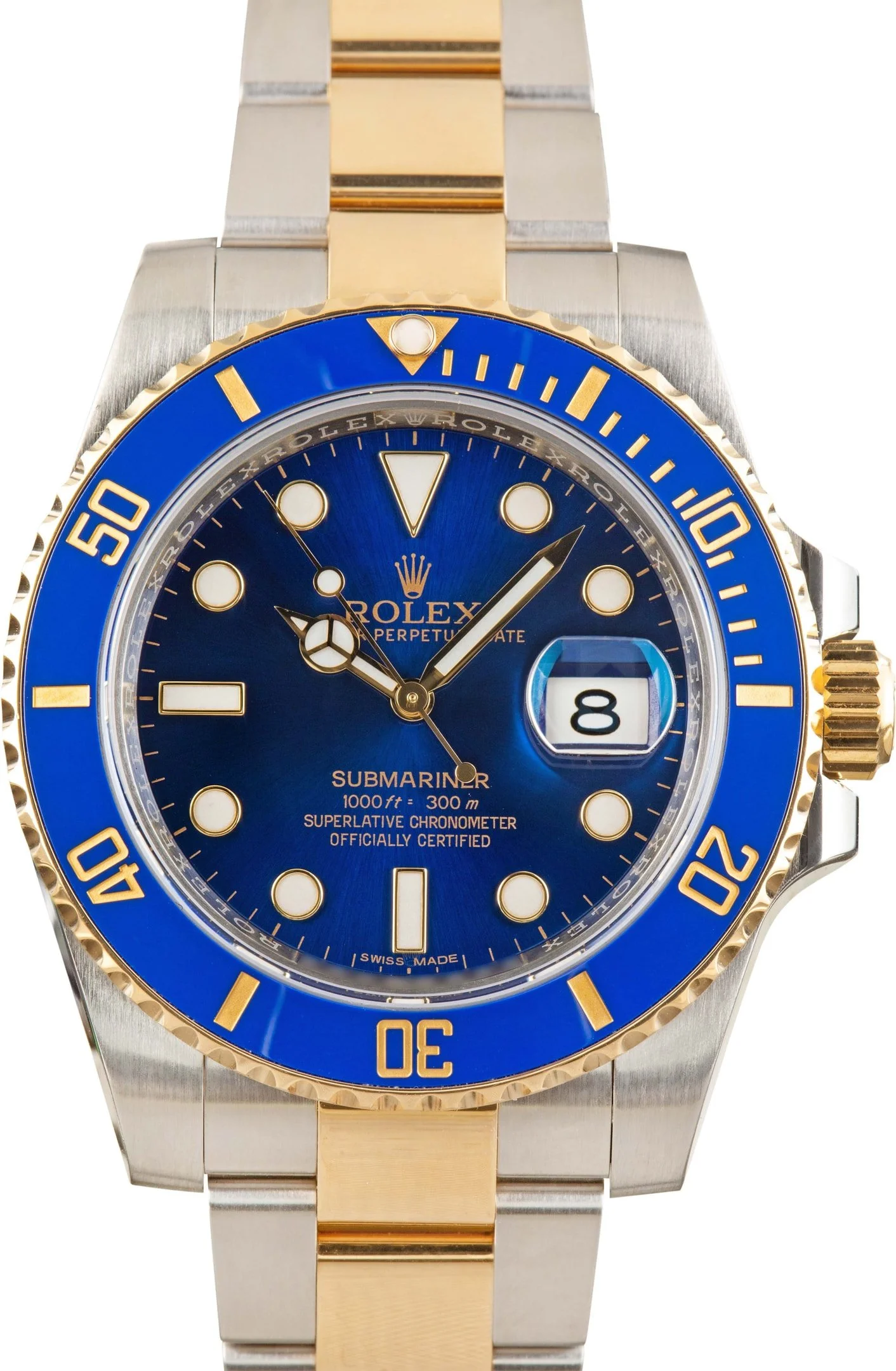 Why We Love This Watch This pre-owned Rolex Submariner ref. 116613LB (2016), affectionately known as the “Bluesy,” blends luxurious style with professional dive performance. The 40mm case, crafted from stainless steel and 18k yellow gold, is complemented by a striking blue Chromalight dial and matching blue Cerachrom bezel for a bold, distinctive look. Powered by the reliable Rolex Caliber 3135 automatic movement, it offers precise timekeeping, a 48-hour power reserve, and water resistance up to 300 meters. Fitted with a two-tone Oyster bracelet featuring the Glidelock clasp, this Submariner embodies strength, sophistication, and unmistakable Rolex character. WATCH DETAILS CREDIT CARD PRICE $16,458.86 BRAND Rolex MODEL NAME Submariner MODEL NUMBER 116613 YEAR 2016 ITEM NUMBER 184991 CONDITION Excellent GENDER Mens BOX & PAPERS Box and Papers CASE MATERIAL Steel and Gold CRYSTAL Sapphire SIZE 40MM BEZEL Ceramic Timing CASEBACK Solid SERIAL 436DWXXX DIAL Blue w/ Luminous hour markers, Chromalight hands & Chromalight lume MOVEMENT CALIBRE 3135 TYPE Automatic BEZEL Unidirectional COMPLICATION Date BRACELET MATERIAL Two-Tone TYPE Oyster CLASP Glidelock
